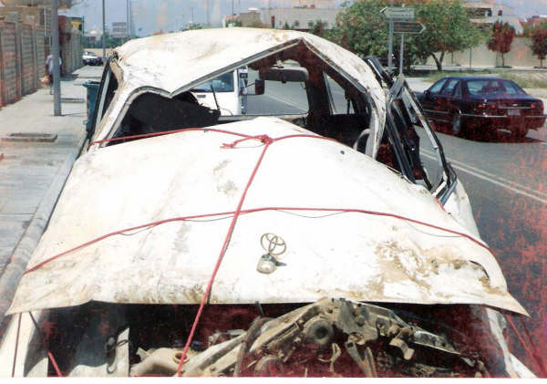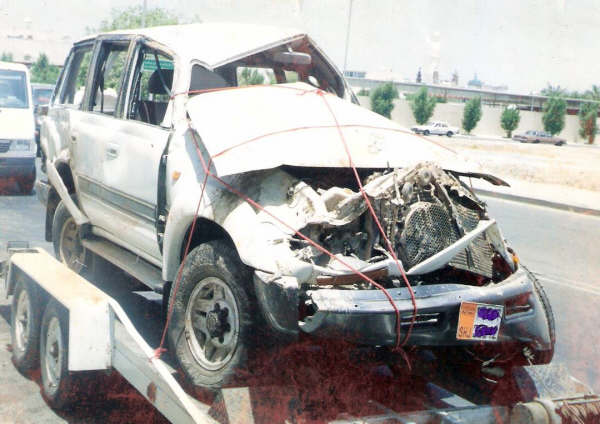وجاء أمر الله وانحرفت سيارته عن الطريق إلى يمين الشارع بمقدار 78 متراً واصتدمت بنخلة وانقلبت مرتين ثم استقرت على وضعها الطبيعي خارج الشارع الرئيسي