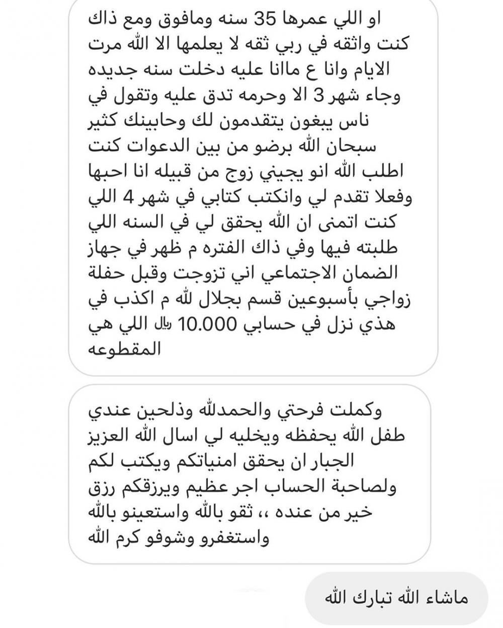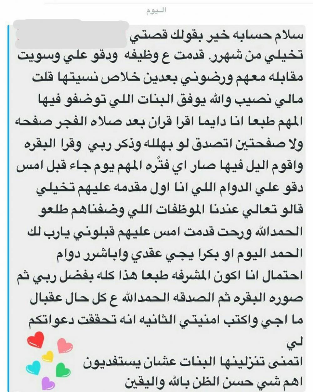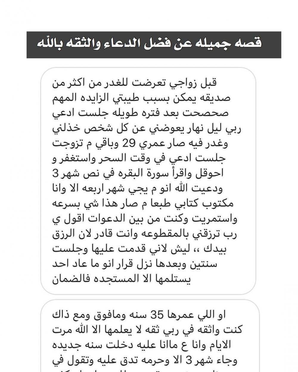 قصتي اني اول ماتزوجت حملت على طول وكان عمري صغير ١٧ وكنت ابكي م ابي طفلي اللي ببطني وكتب الله وجتني بنت مثل القمر وجلست اقول ان شاء الله م يجيني عيال الفتره اللي بعد ولادتي ببنتي وقعدت ٤سنوات على المانع ولما فكيته اخذت سنه ابي احمل ولا كتب الله قلت في خاطري اكيد هذي عقوبه الله علي بسبب كلامي اني م ابي اطفال وصرت اقراء البقرة كل يوم واصلي الوتر واستغفر والحمدلله ماأخذت فتره الا رحت المستشفى اسوي تحاليل قال الدكتور عندي خمول بسيط فالغده واعطاني العلاج ومن اول شهر حملت وكنت ادعي الله يكون طفلي تام الخلق والخلقه ولما وصلت الشهر السابع قالو احتمال تشوه الجنين بس ماصدقت وصرت اكثف دعائي والحمدلله وقت الولادة جبت ولد جميل وتام الخلقه والله يجعله تام الخُلق وهذي قصتي