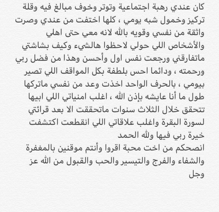 ومع الوقت خف مابي وشبه اختفى ونادر احس فيه وخفت الالم مع الاذكار والاستغفار والحوقله والصلاة على الرسول وتكرار سورة الفاتحه في اليوم والان اتمنى الله يكون راضي عني الحمدالله على ما أنا فيه من راحه وانشششراح الصدر ولن اتوقف عنها يوم سأستمر عليها ان شاء الله طول عمري ..