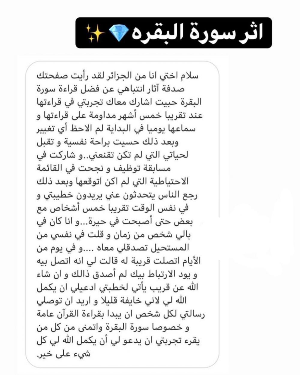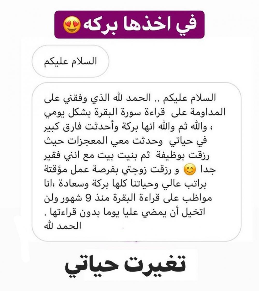 اي تسخير بينكم في اليوم اللي قرأتوا فيه سورة البقرة وتشعروا بتوافق وانسجام هي ببركة السورة في المنزل 😍♥️ الشيطان أعظم مهمة عنده كل يوم هو أن يفرق بين الأزواج ويفتعل المشاكل، لان اذا نجح وفرق بين الزوجين كبير الشياطين ابليس يقدم مكآفأة عظيمة له، وترقية والعياذ بالله يعني الشيطان ما رح يترك المتزوجين الا ان يفرق بينهم وينشأ بينهم المشاحنات والكره، فلما تقرؤو سورة البقرة ربي يسخر لكم ملائكة اقوياء جدا تحمي بيتكم من دخول الشياطين وتصيروا بحماية الله 😌💛 لا تتركوها ابدا 💕