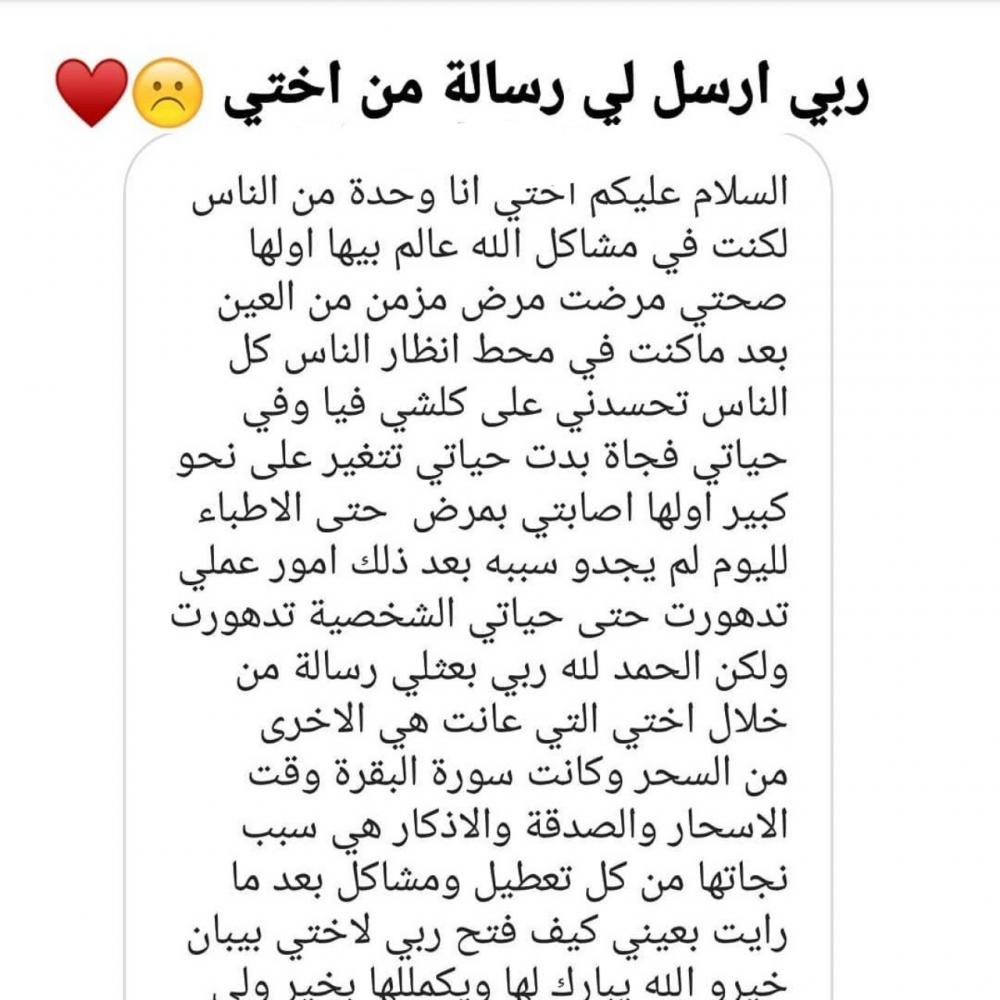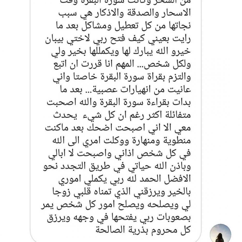 فتاة جميلة .. خلوقة أنيقة .. بلغ عمرها (٢٦) ولم يتقدم أي أحد لخطبتها رأت أختنا في الله رؤيا، وعندما فسرتها عند أحد المشايخ الأفاضل قال لها: إن علاجها هو السر العجيب ( سورة البقرة ) .. فأخذت تقوم الليل يوميا بسورة البقرة، ثم أخذت تقرأها مع أذكار الصباح والمساء، بمعنى أنها كانت تقرأها ثلاث مرات يوميا .. ولم يخيب الرحمن الرحيم ظنها .. فسرعان ما طرق بابها شاب صالح .. الكل كان يثني على أخلاقه وعلى مركزه .. كانت أخيتنا ترضى بالقليل، ولكن أكرم الأكرمين رزقها فوق ما تتمنى..