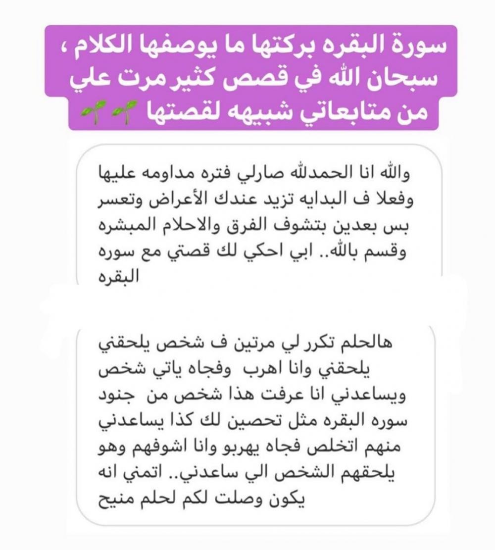 هل غذيت روحك يوماً، هل أعطيتها حقها بالحياة،هل سقيت قلبك من سورة البقرة، هل فكرت أن تروي نفسك من لذتها ،إن بدأت بها يوماً سترى عجائب آيات الله بها ، سيسعد الله قلبك حتى وإن لم يكن هناك سبب لسعادتك ' سورة البقرة بحد ذاتها فرحةٌ لقلبك ،رزق وعافية من خالقي ، حياة لمن يريد الحياة يكفي أن رسول الله صلى الله وعليه وسلم قال: "قراءتها بركة وتركها حسرة"علمت الآن معنی حدیث حبيبي رسول الله حينها بدأت بها وأرحت قلبي بها وعالجت داخلى بعد الله بها، إن بدأت بها يوماً ستستمر بها سنيناً.