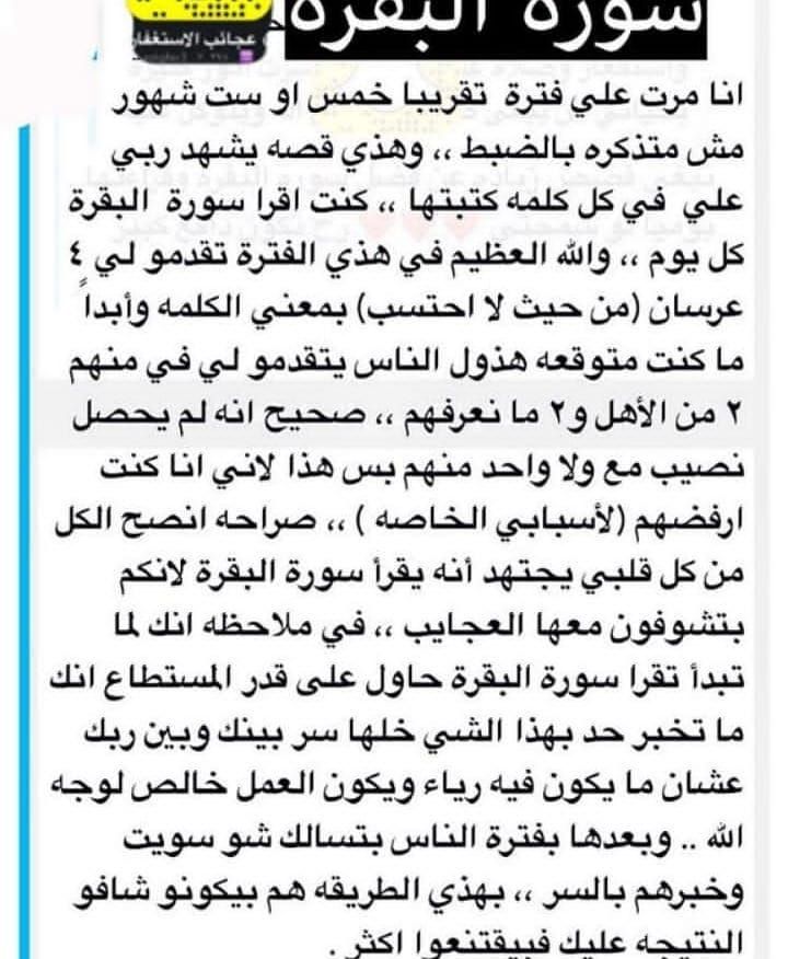 انا كنت مع زوجي كثيرة الزعل على اتفه الامور ومشاكل واجلس زعلانه بالايام واحس الدنيا ضاقت على صدري ،سبحان ربي لما بديت اقرأ سورة البقرة طبعا كوابيس كنت اشوفها بالنوم بس الحمدلله تغيرت نفسيتي ماعاد ازعل كثير واذا زعلت احيانًا مش زي زمان نجلس ايام نتصالح بنفس اليوم .الكلام معاد اتحسس منه احس نفسيتي تحسنت كثييير بفضل الله اضافه ان لاحضت يوم اقرأها زوجي يقولي وجهك منور عامل شي فيه سبحان الله.
