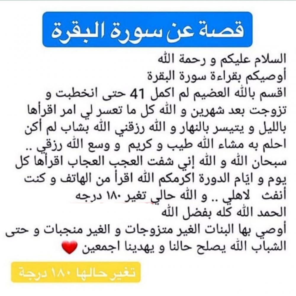 قصتي مع سورة البقرة والله العظيم كانت عندي مشاكل كثيره جدا جدا كنت ابكي كيف تنحل هذه المشاكل قفلت في وجهي جميع الطرق لكن سبحااااااااااان الواحد الاحد الفرد الصمد ، وحده جزاها الله خير رسلت في الواتس عن فضل سورة البقرة وسحرها العجيب قلت في نفسي خليني اجرب اسبوع وبالفعل جربت لكن كان سحرها من اول جلسة كنت احس بإحساس عجيب راحة وطمئنينه واصلت كل يوم أقرأها بدأت المشاكل تنحل ماشاءالله تبارك الله وفوق هذا بركه في يومي ورزقي وأحس عقلي كبر وفاهمه وصرت اعرف اتخاطب مع الناس قبل كنت خجوله لذلك ارجوا منكم قرائتها