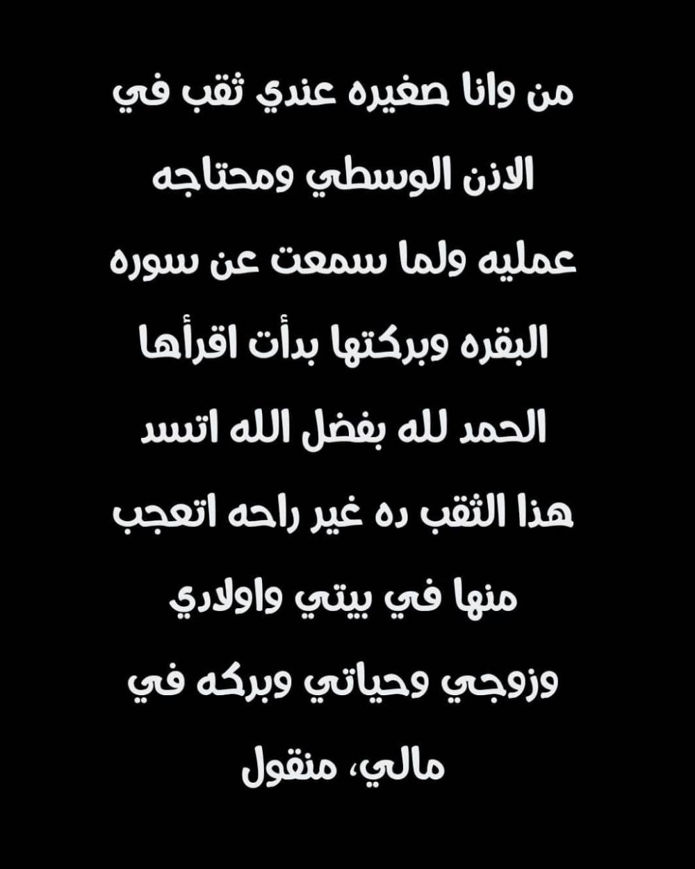 اختي انا صارت معي مشاكل كثييييييييره وماتتخيليها ولاحد ممكن يتخيلها كنت حامل وعندي مرض القلب والكل يقول انزل الطفل وانا متمسكة فيه حتي زوجي كان يقول انزله عشان خايفين عليا وكان حلمي اكون ام مع انه لسه عمري صغير بس احب الاطفال وف كل مرة كانوا يقولوا انزله كنت اقرا سورة البقرة ثلاث مرات يوميا وربي سخر قلوبهم وتخيليي في اليوم الي رحنا نكشف فيه عند دكتوري حق القلب قال ماعليها أي خطوره تواصل الحمل دامها دخل الشهر السادس والحمد لله ولدت قيصري صح بس تسهل لي كل شي وابني الان ععمره 11 شهر ادعولي ربي يحفظه لي وينبته نبات حسن،، في اليوم كانوا بينزلوا الطفل وانا ماياست واقسم بالله كنت اقري سورة البقرة للااخر لحظه وانا بشهر السادس دخل دكتور القلب المتخصص في المستشفي وقال تواصل الحمل دامها دخلت في الشهر السادس ماعليها اي خطوره فضل سورة البقره كبيييير جداً ويسخرلك كل شي صعب وتتمنيه .