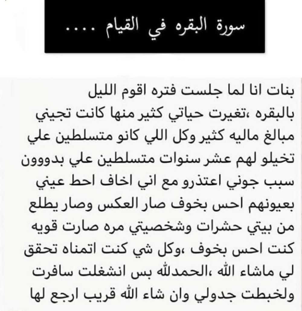 ( منذو أسبوعين وأنا مواصلة ع قراءة سورة البقرة ف القيام )