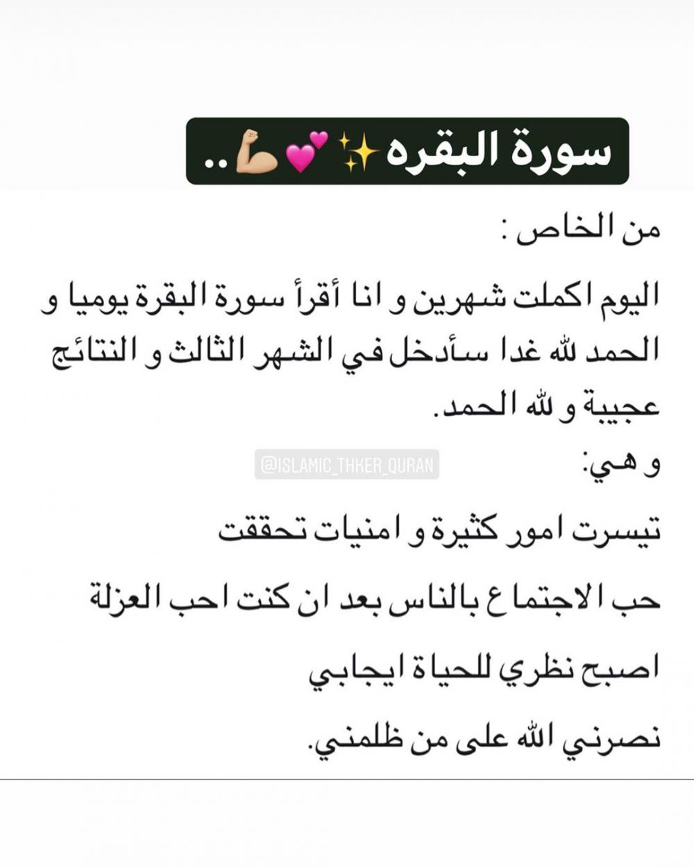الحمد لله حمدا كثيرا طيبا . . الحمد لله أن منّ علي ربي بالمداومة على قراءتها . . صارلي ۷ سنوات متزوجة ، وزوجي عنيد ما يسمع رأيي بشي في كل الأمور والحين أي شي أقوله له بسرعه يسويه . . حتى اول اتمنى يقوم يصلي القيام . . والحين بدأ،،