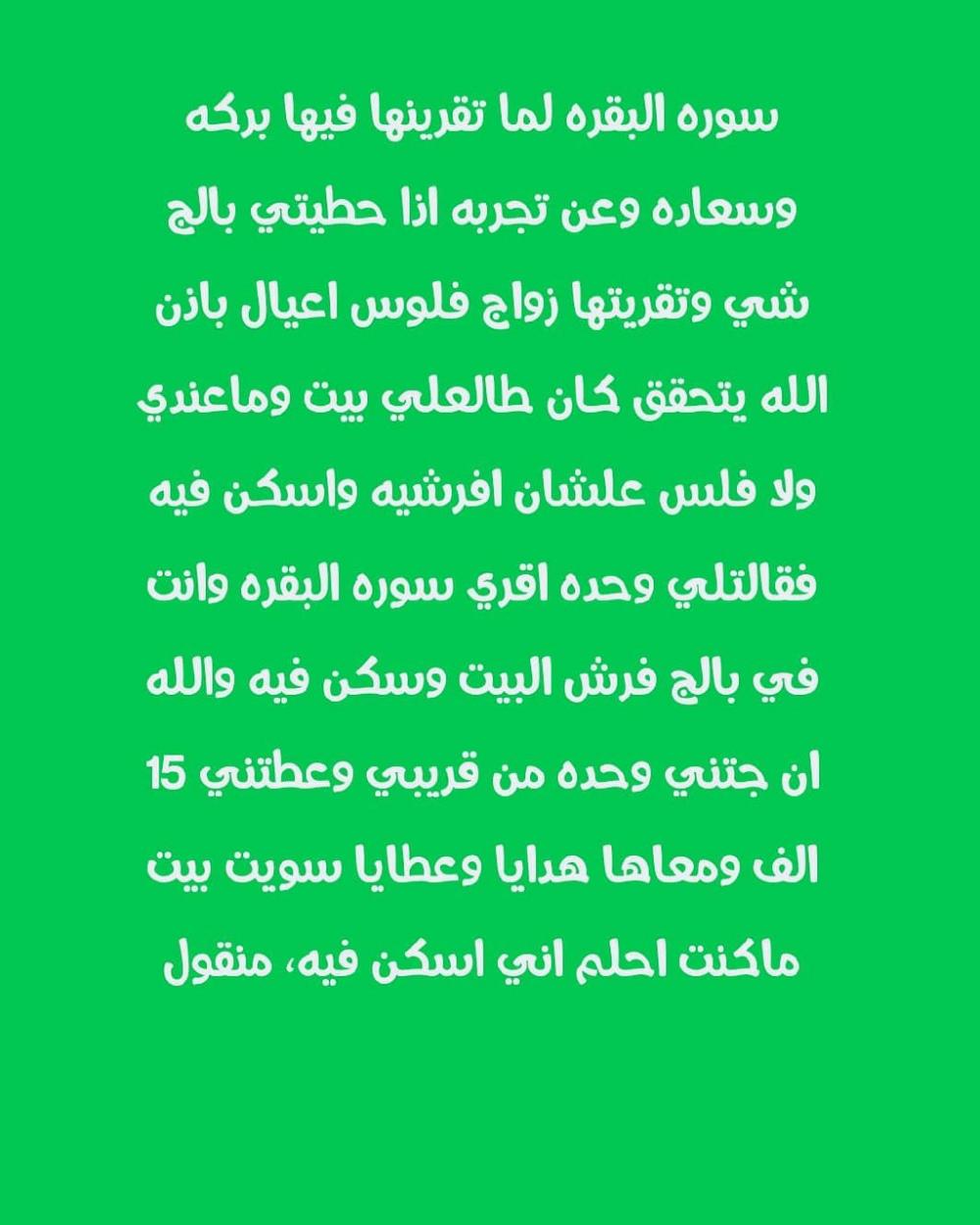 فقال لي : هذا رزق من السماء وعين قوية خرجت منك وسوف ترزقين بإذن الله تعالى ذرية .... ( قبل نهاية شهرين من بداية قراءة سورة البقرة ) انقطعت عني الدورة وحملت بفضل الله ورزقت بابنة وأسميتها طيف .