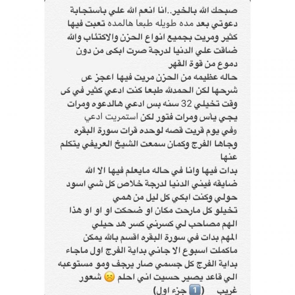 قراءت تجارب البنات ومشاركاتهم في هذا الموضوع وبكيت كثيرا على تجارب بعض البنات وكنت ادعي لنفسي وللبنات المشاركات ثم صرت اقراء سورة البقره يوميا ثم حفظتها كامله ماشاء الله لا قوة الا بالله ثم صرت اقراءها بالغييب يوميا في النهار وانا في العمل واصلي بها قيام الليل في اربع ركعات بالاضافه الى الاستغفار والتسبيح والدعاء طول اليوم وفي كل وقت ولله الحمد