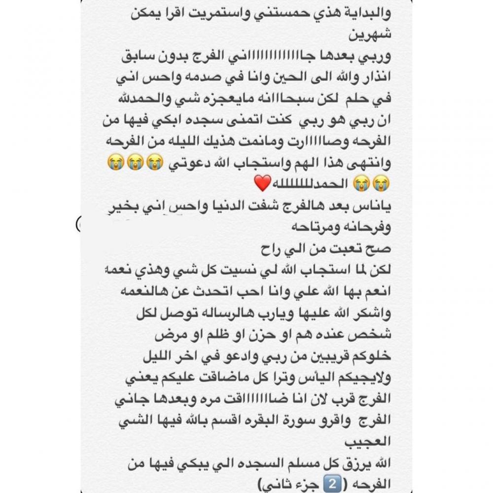 كلها وذهبت إلى المستشفيات ضمنها مستشفى التخصصي ..... طلب مني المستشفى مبالغ ضخمة من المال وبعدها قالوا : إنه لا فائدة من العلاج .. وبعدها أعطوني الملف وقالوا : لا تضيعي وقتك وتخسري أموالك حالتك ميؤس منها ... بعدها تقول طرقت باب رب العالمين ... أخذت أقرأ سورة البقرة وأقوم الليل