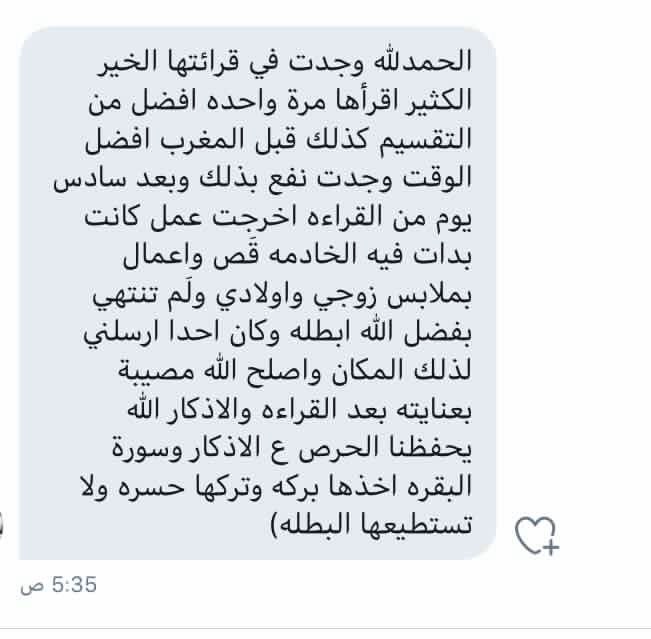 أنا فتاة عمري ٢٠ سنة قبل تقريباً شهرين كنت مصابة بالوسواس القهري بالأفكار والدين وكنت أعاني معاناة لا يعلم فيها الا الله محد يعرف لا اهلي ولا صديقاتي كان بمثابة حرب داخلية حرقني الوسواس بدون اي مبالغة اللي مجرب يعرف شعوري يشبه النار اللي تاكل الشخص من الداخل بدأت ابحث واقرأ عن فضل سورة البقرة وألتزمت فيها لمدة تقريباً شهر كنت اقرأها بجلسة وحدة بصوت عالي بحيث اسمع نفسي الحمدلله من شهرين تحسنت وبدأت اشوف الحياة مريحة سورة البقرة بعد الله مثل شي بارد على قلبي الحمدلله رب العالمين .