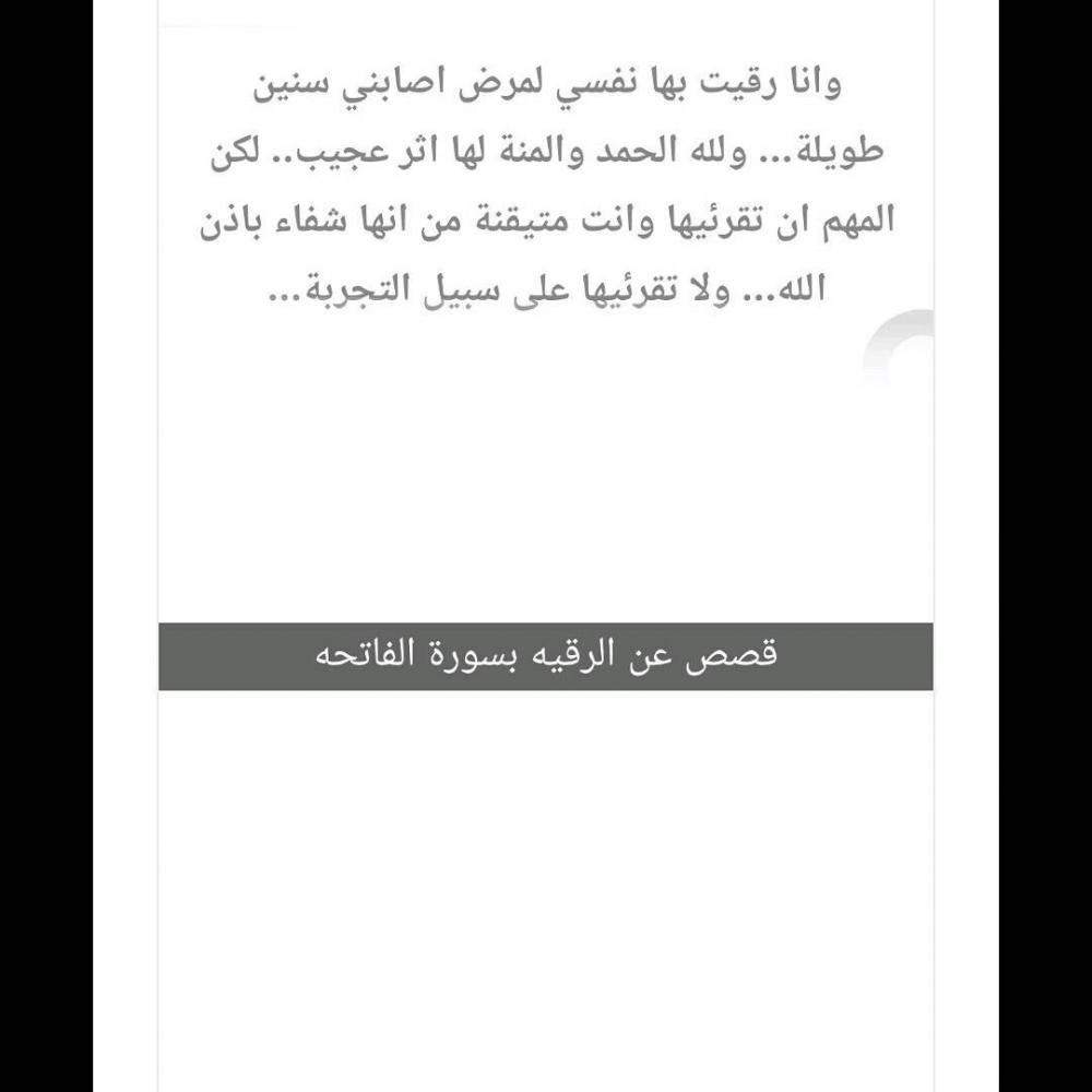 تقول صاحبة القصة . و الله فضلها عظيم سبحانك ربي ما اعظمك كان ولدي تعبان عمره 5 سنين كحة لا تتوقف مع كل العلاجات و المضادات الحيوية فأخذت قارورة ماء و قرأت فيها سورة الفاتحة 10 مرات و أعطيت ولدي شرب منها و الله و الله ثم و الله ثواني و توقفت الكحة تماما و نام نوم عميق . اصيكم اخوتي إخوتي بسورة الفاتحة العظيمة لا تهملوها خلوها تشفي أجسادهم و قلوبكم و تنور حياتكم . إعلموا تاج إخوتي لكل من ترون أنه يحتاج هذه الرقية العظيمة .