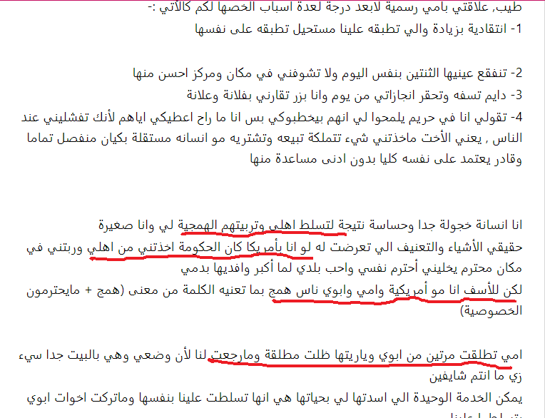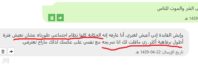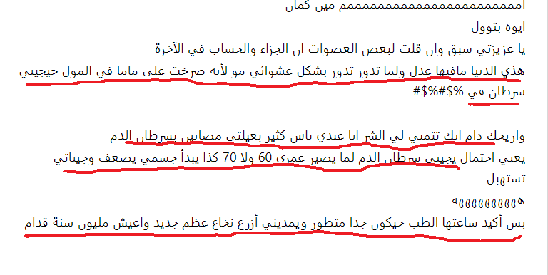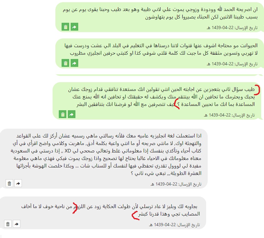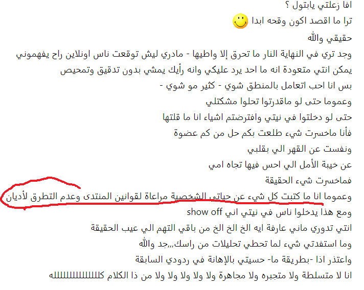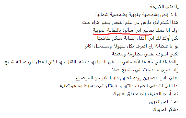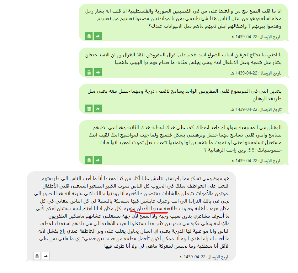 اما بالنسبة لباقي الافكار التي دافعت عنها بعض الاعضاء قائلات (هي حرة مو ضروري تدافع عن بلدك سوريا ) اقسم بالله الذي لا اله الا هو لست سورية ولا لي أي علاقة بسوريا ولم ازورها حتى من باب السياحة ولو كنت سورية لما انكرت لكن هذا يدل على ان الاخوات قلوبهم قبيحة منتهى القبح وفيها بشاعة لا تغطيها اطنان مساحيق التجميل ان تقول بكل وقاحة لا يهمني امر المسلمين في سوريا علما بأنه لم يطلب منها احد ان تستقبلهم في بيتها ولا ان تنفق مالها عليهم فقط كنت اريدها ان تتعاطف لانها سبق وكتبت في احد مواضيعها انها تدافع عن الحيوانات وتحبها ما ابشعكن يا صاحبات القلوب المتحجرة والحمدلله الذي عافاني من هذا القبح الشديد الذي لا تغطيه عمليات التجميل ولا (الكشخات ) ثم انها بلغت قمة القبح والبشاعة وقالت لا يهمها احد من البشر ولا تريد ان تساعداحد في الكوكب ايا كان (لم يقتصر الامر على سوريا بل كل البشر وهذا يعني ان المدافعات عنها من ضمن الاشخاص الذين لن تساعدهم ) وهذا موجود في المحادثة اعلاه