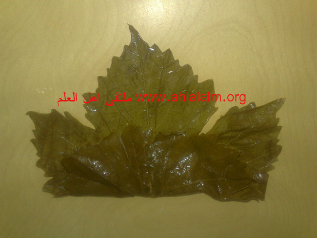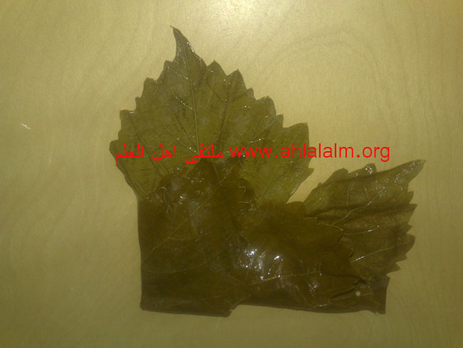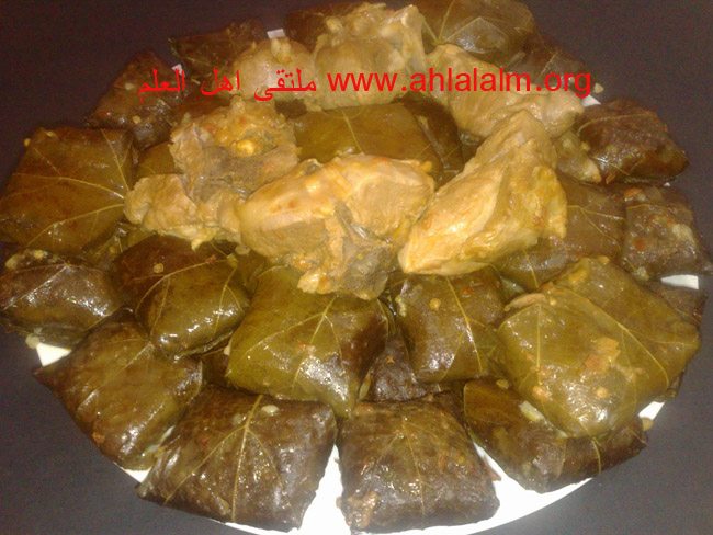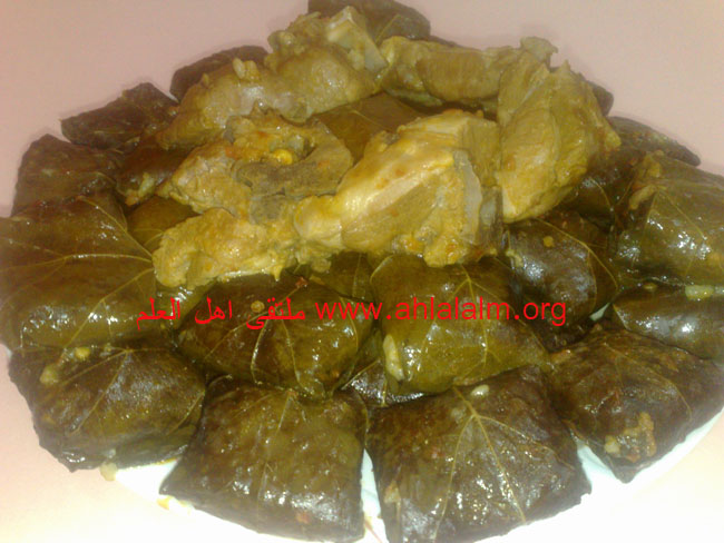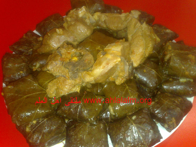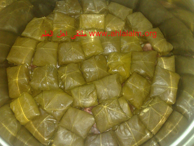 * تُحشى ورق العنب وذلك بوضع الحشو في مقدمة الورق وتطوى من الأعلى
