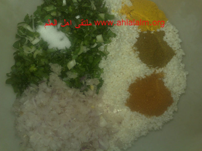 * يُخلط الرز والبصلة والكركم والأجنموتوا ، والملح والكمون ، وبهارات حائل والفلفل الأحمر الحار ، والبصل الأخضر.