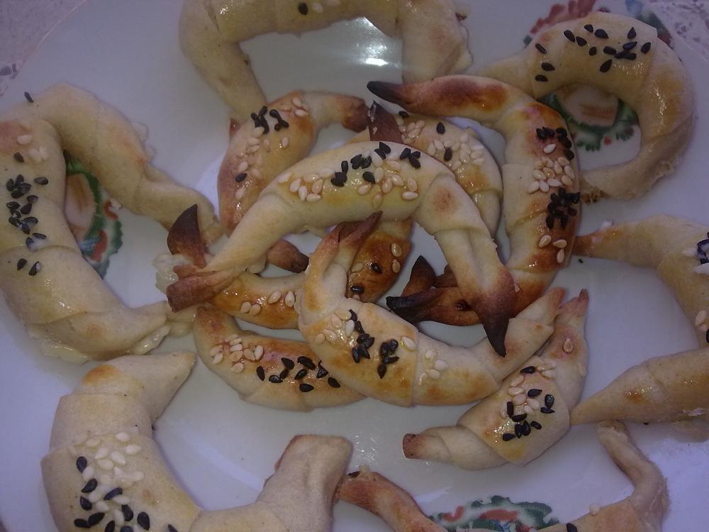 ثم تلف من قاعدة المثلث باتجاه الراس ثم تدهن بالبيض ويوضع السمسم وحبة البركة والى الفرن