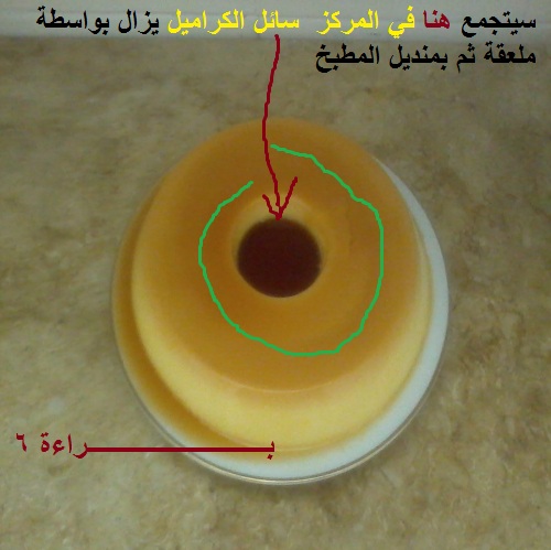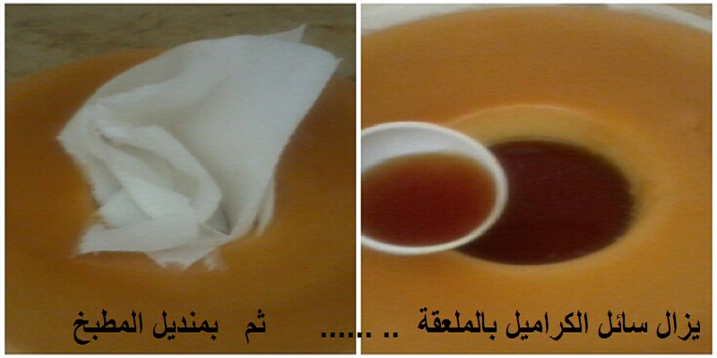 تجمع سائل كراميل في المركزوسط الكريما نقوم بإزالته بواسطة ملعقة ثم منديل المطبخ