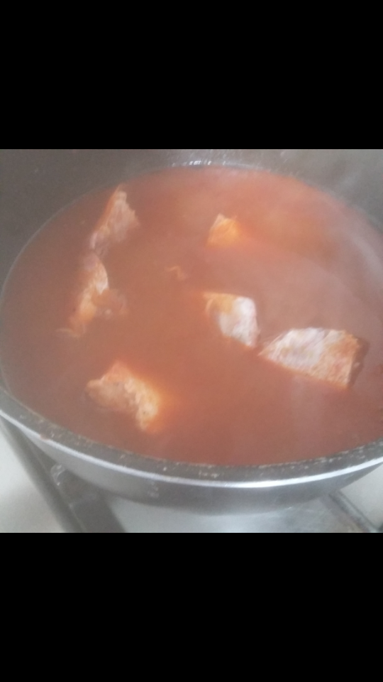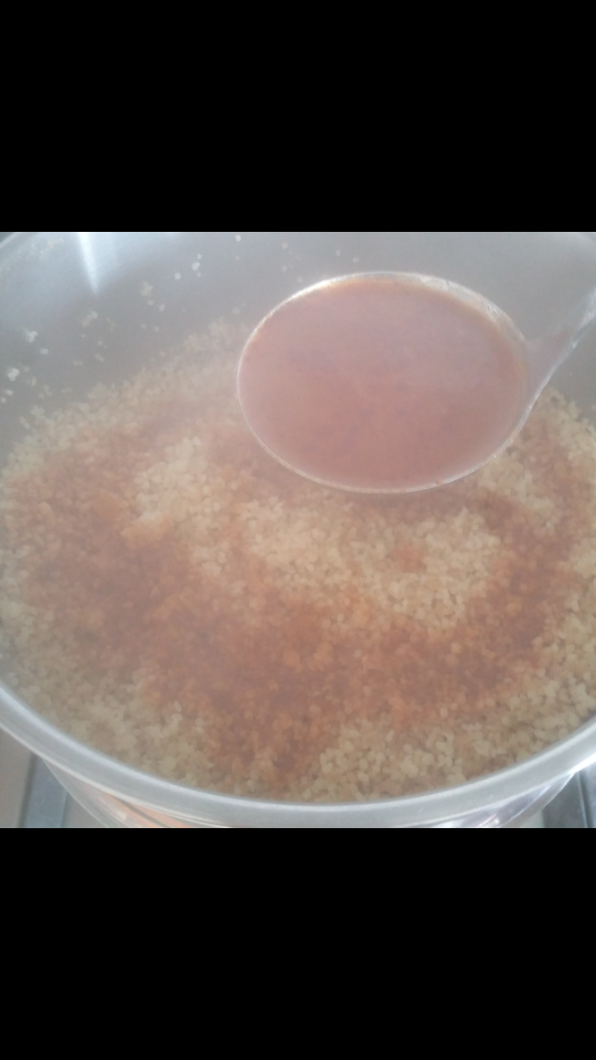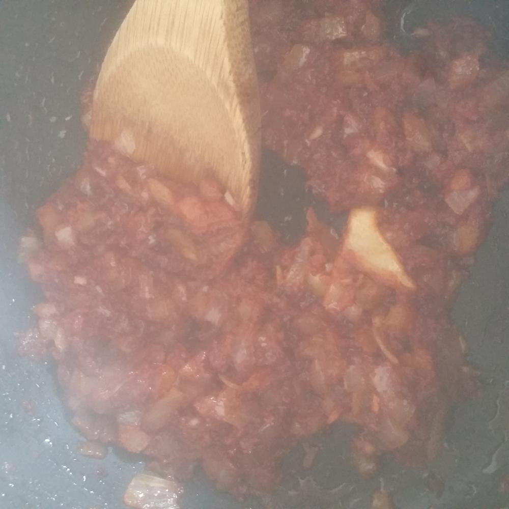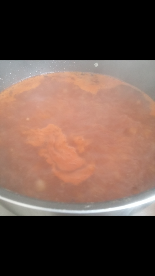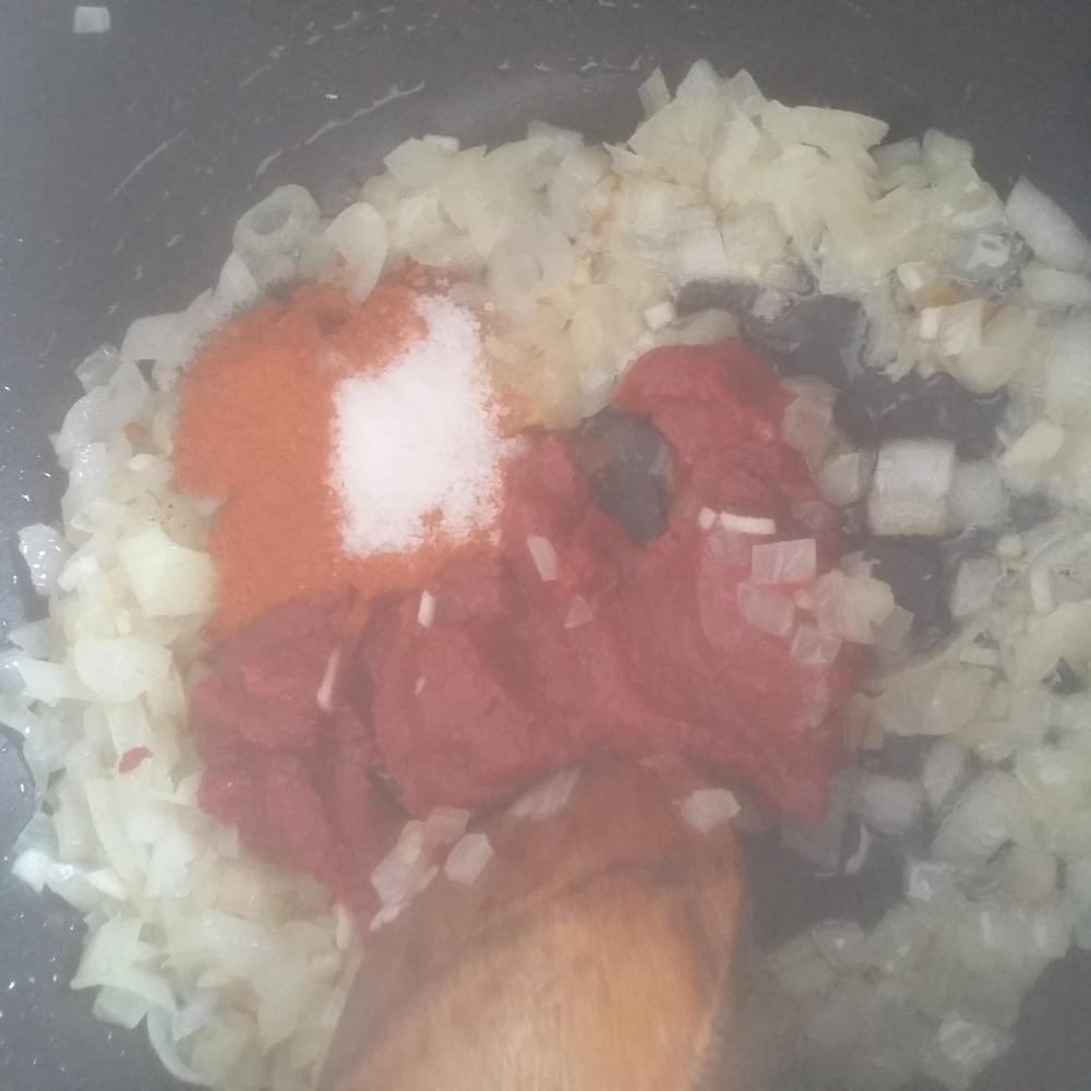 ... نضيف 2 ملاعق معجون طماطم و ملعقة فلفل احمر بودرة حار... ملعقة فلفل اسود و زيها ملح و ملعقة كمون ... نحركهم دقيقتين ثم تضيف 3 أكواب ماء ساخن و نخليها تتسبك حوالي ربع ساعة