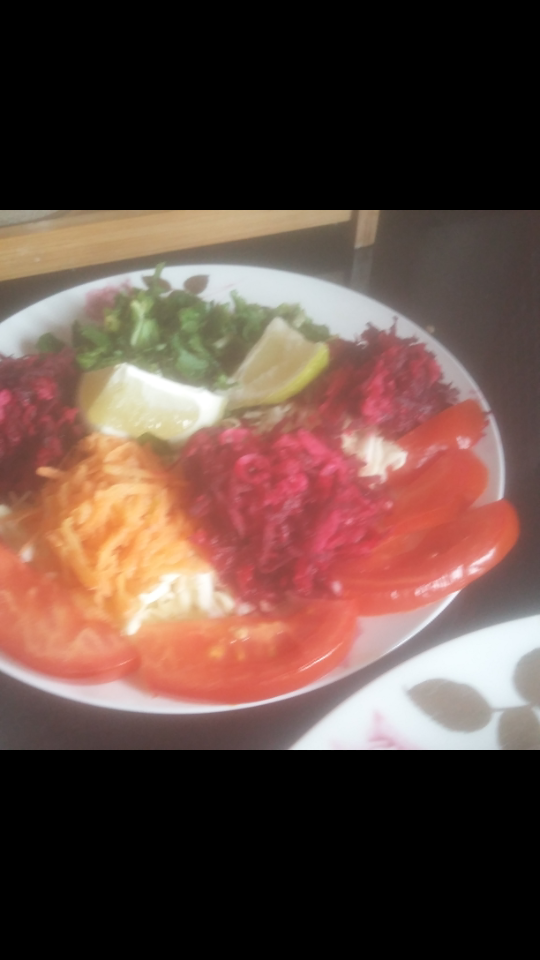 ... اسكبيه في صحن التقديم ..زيني بباقي الطبيخة و الفلفلالمقلي و الباذنجان الكوسة و البطاطا المقلية و قدمت جنبه سلطة مشكلة صحتين....