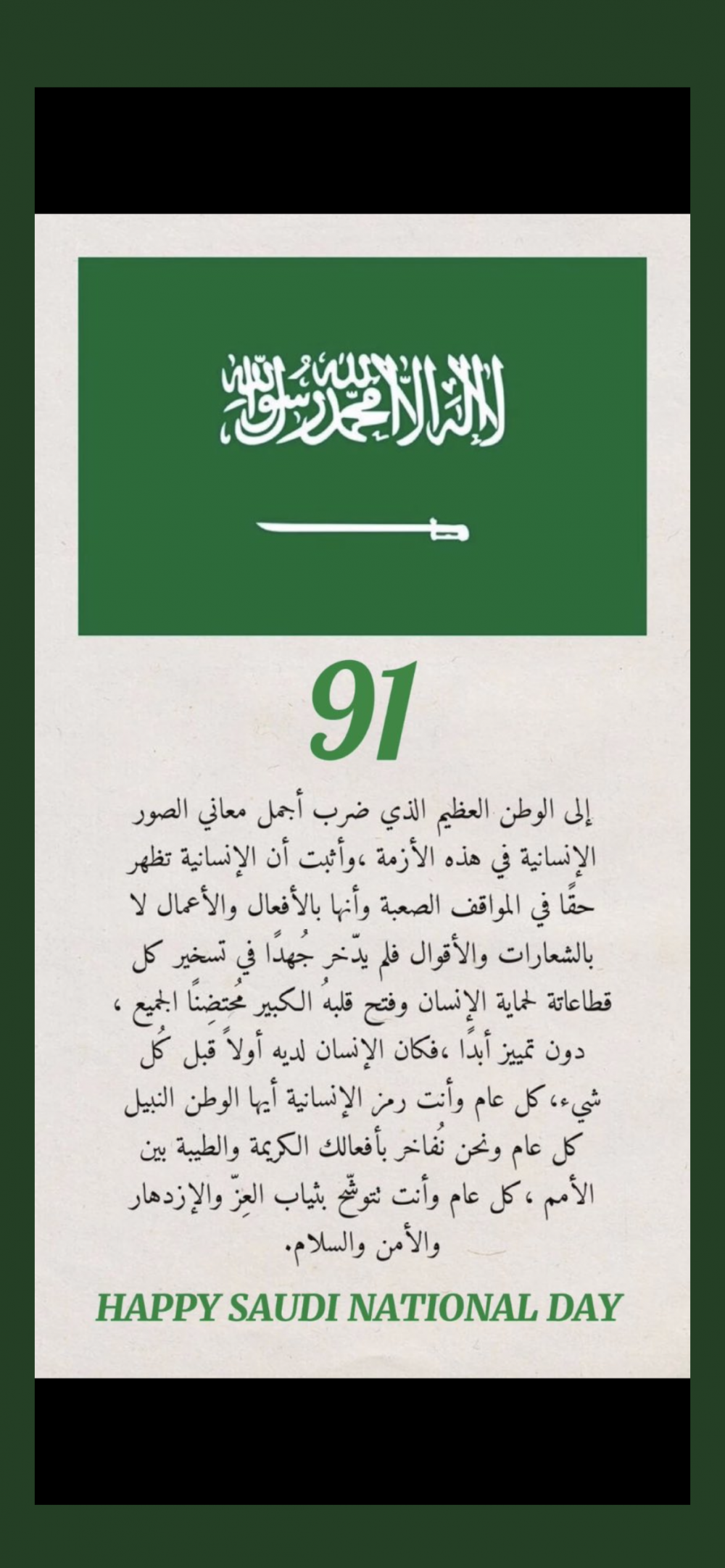 91 عاما والسعودية تعانق السماء مجدا وعزا. دمت يابلادي حبا وعشقا للأبد.