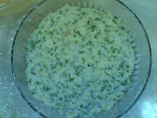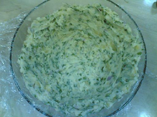 يهرس البطاط بالشوكة جيدا ويضاف له بقية المقادير ثم توضع المقادير على القاع وجوانب الزبدية مع ترك كميه للتغطية في النهاية كما هو موضح في الصورة
