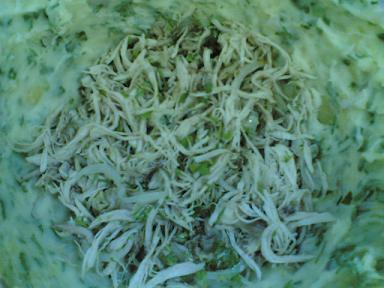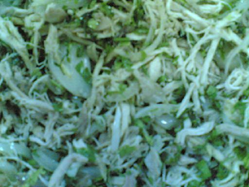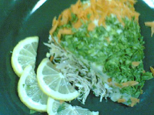 دجاجه مسلوقه ومفتته/ بصلة مقطعه شرائح طويلة /بقدونس / ملح / قليل من الزيت زيتون / فلفل اسود / عصير نص ليمونة