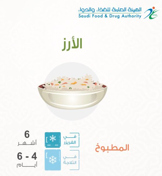 شوفي بالصوره المدة لحفظ الارز المطبوخ بالثلاجه والفريزر من هيئة الغذاء والدواء