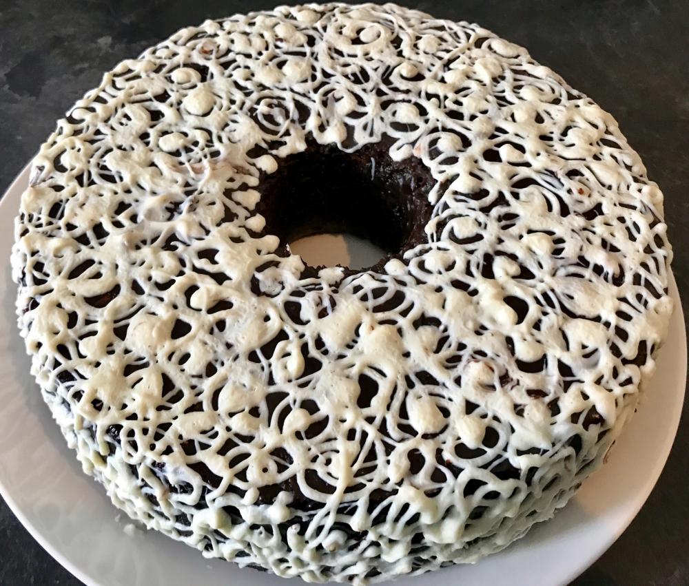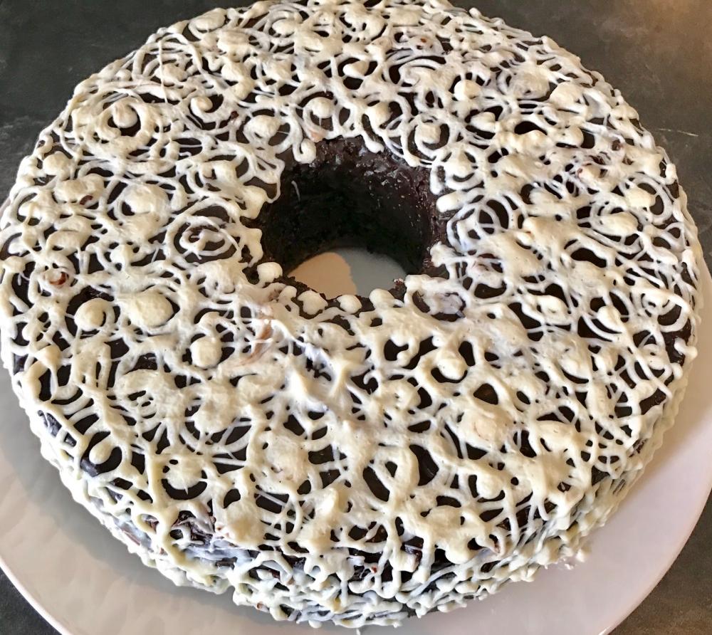 المقادير:كوب سكركوب زيت معلقة صغيرة بيكنج باودر ملعقة صغيرة فانيلاكوب زبادي نصف كوب حليبربع كوب بودرة كاكاوملعقة صغيرة بيكربونات صودا3 بيضاتالطريقة: يخفق البيض ويضاف له السكر بالتدريج ثم الفانيلا ثم الزيت والحليب والزباديثم نضيف بقية المقادير الجافة ويخبز في فرن متوسط الحرارة للتزيين: معجون سكر حسب الصورة أدناه أو شيكولاتة مذابة