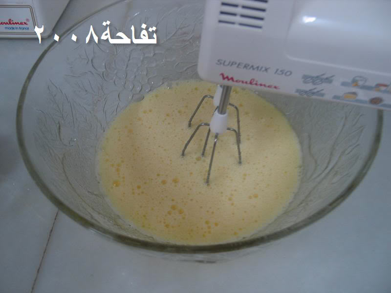 ثم نضيف البيض ونخلط حتى يتضاعف حجمه ثم نضيف الزبادي
