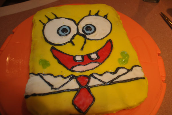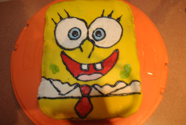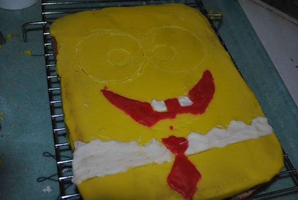 1-اول شي الجزء السفلي من سبونجبوب البنطال والكرفتة والقميص الابيض وننتبة ان يكون القميص متوازي للكيكة(غلطتي شوي مايل)