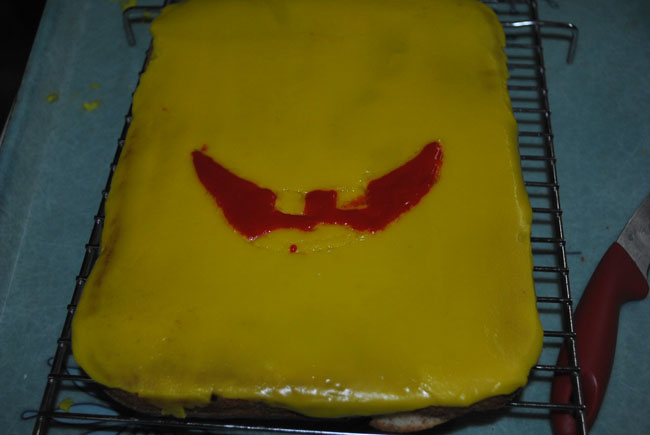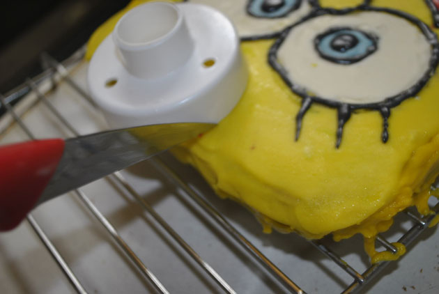 4- نصب الشوكلا الصفرا بسرعة على وجة الكيكة ونساويها بسباتولا او ظهر سكين(نحاول نخلي طبقة الشوكلا كلها متساوية وتغطي الكيكة كاملة بالتساوي يعني مو جهة جبل وجهة هضب والثالث وادي