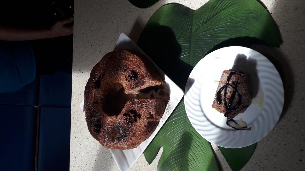جهزت الصينه وحطيت نص الخليط واضفت حبات الشكولاته وغطيتها بباقي الخليط ورشيت على الوجه باقي الشكولاته ... حطيتها في الفرن على درجه حراره ١٩٠ لمده اربعين دقيقه هنا لما طلعته وخليتها تبرد وقلبتها