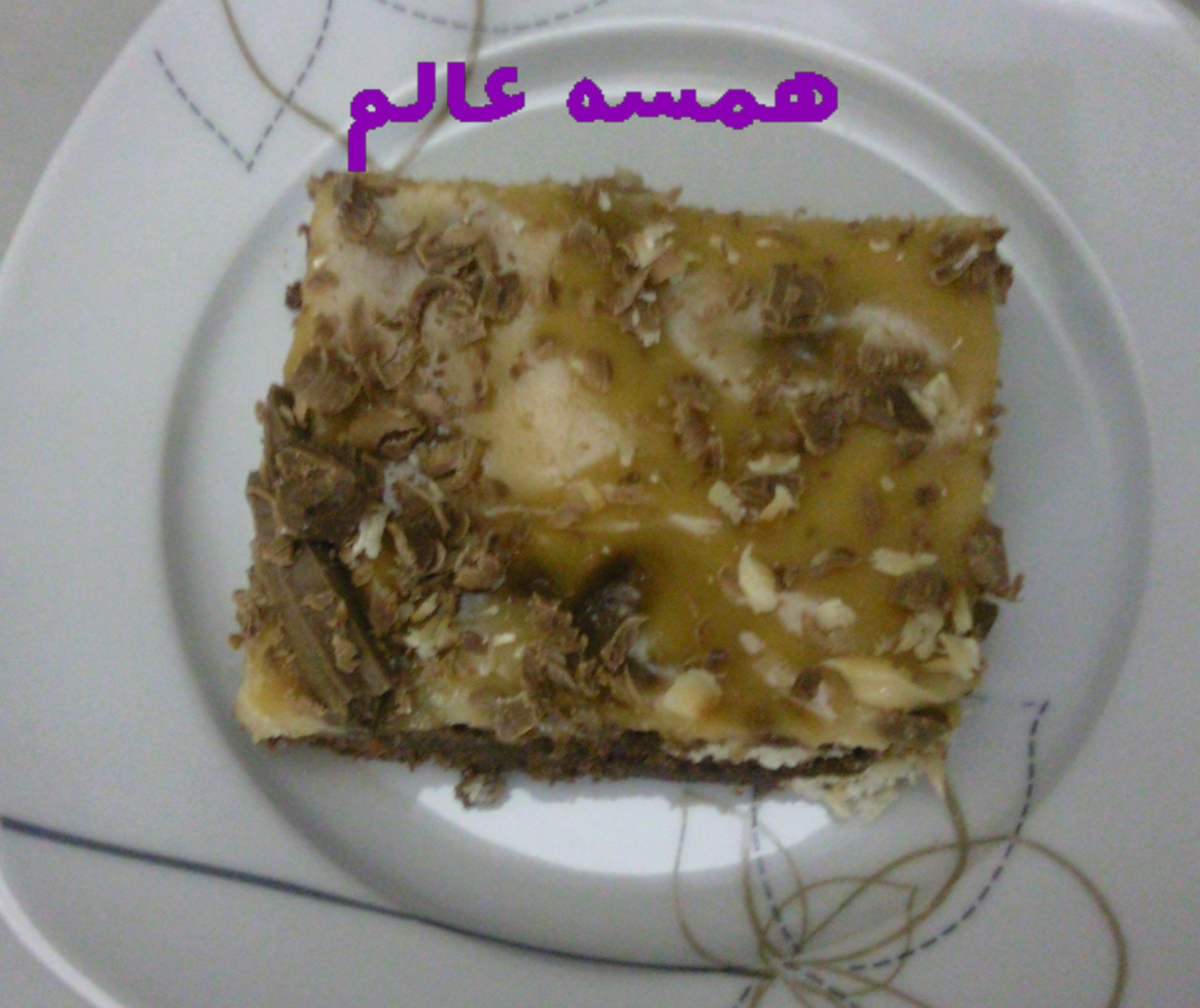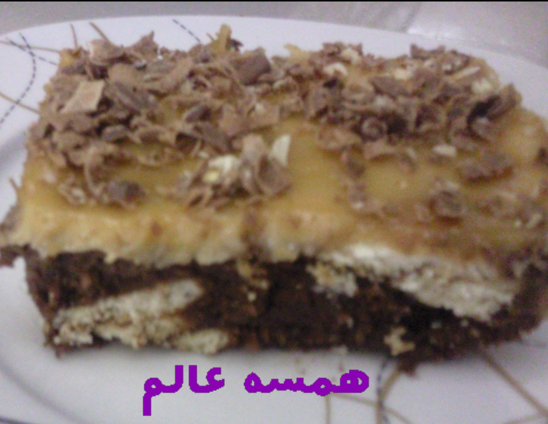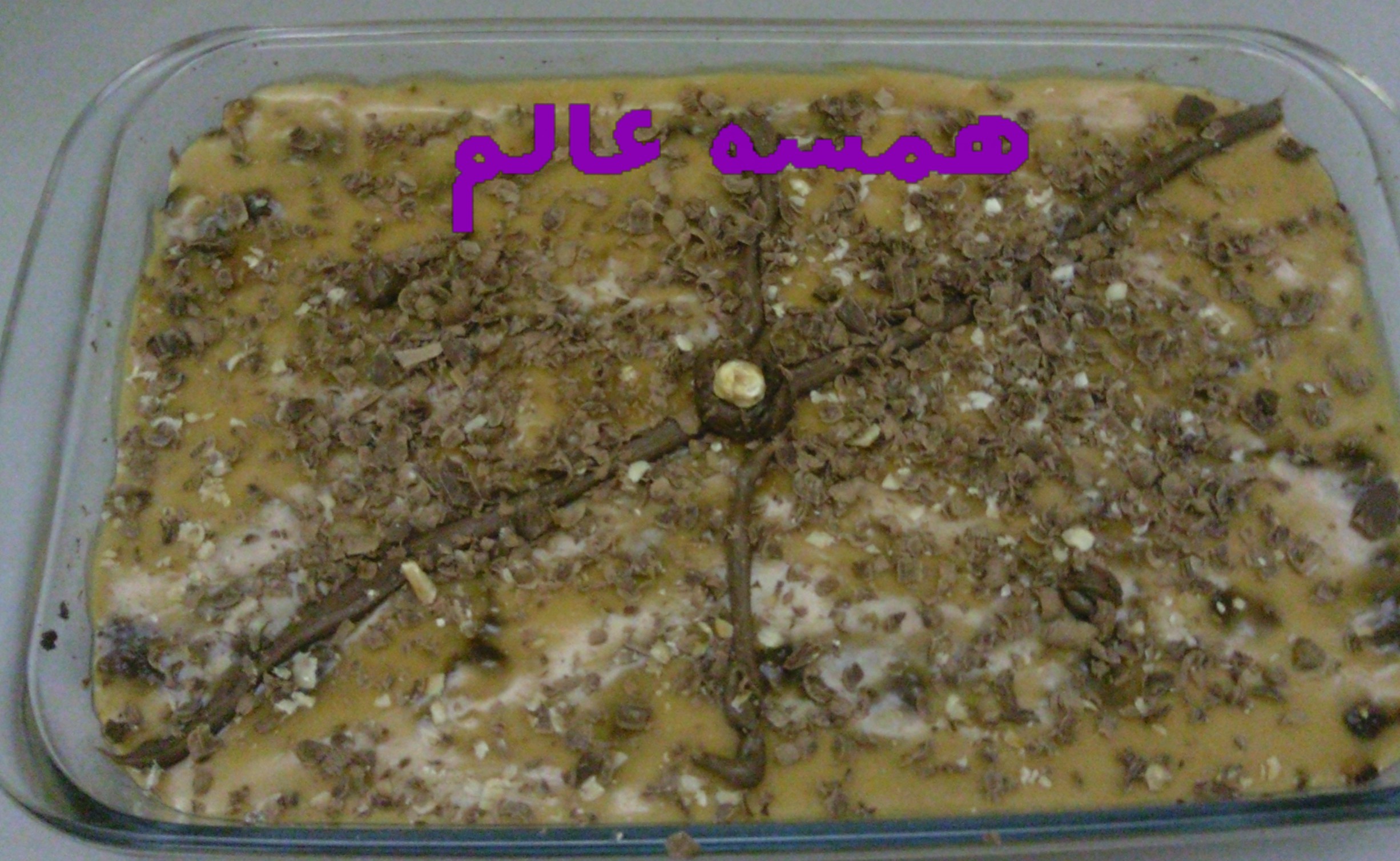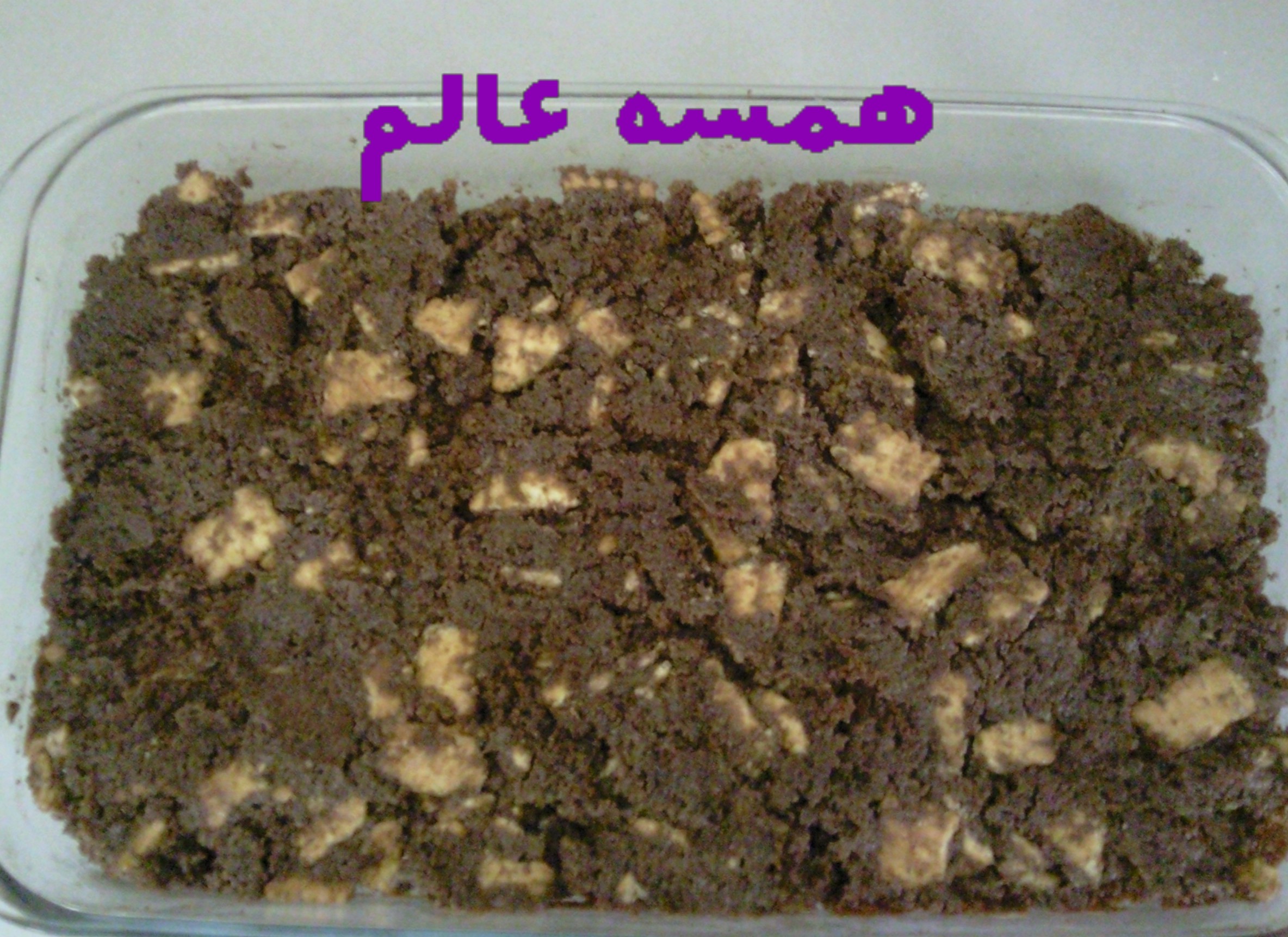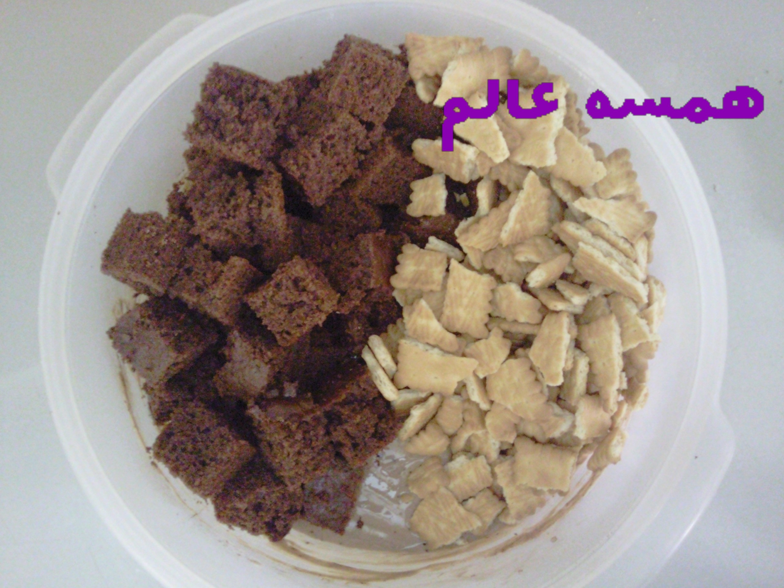 ويوضع الكيكه والبسكويت على خلطة القشطة ويخلط يجيد