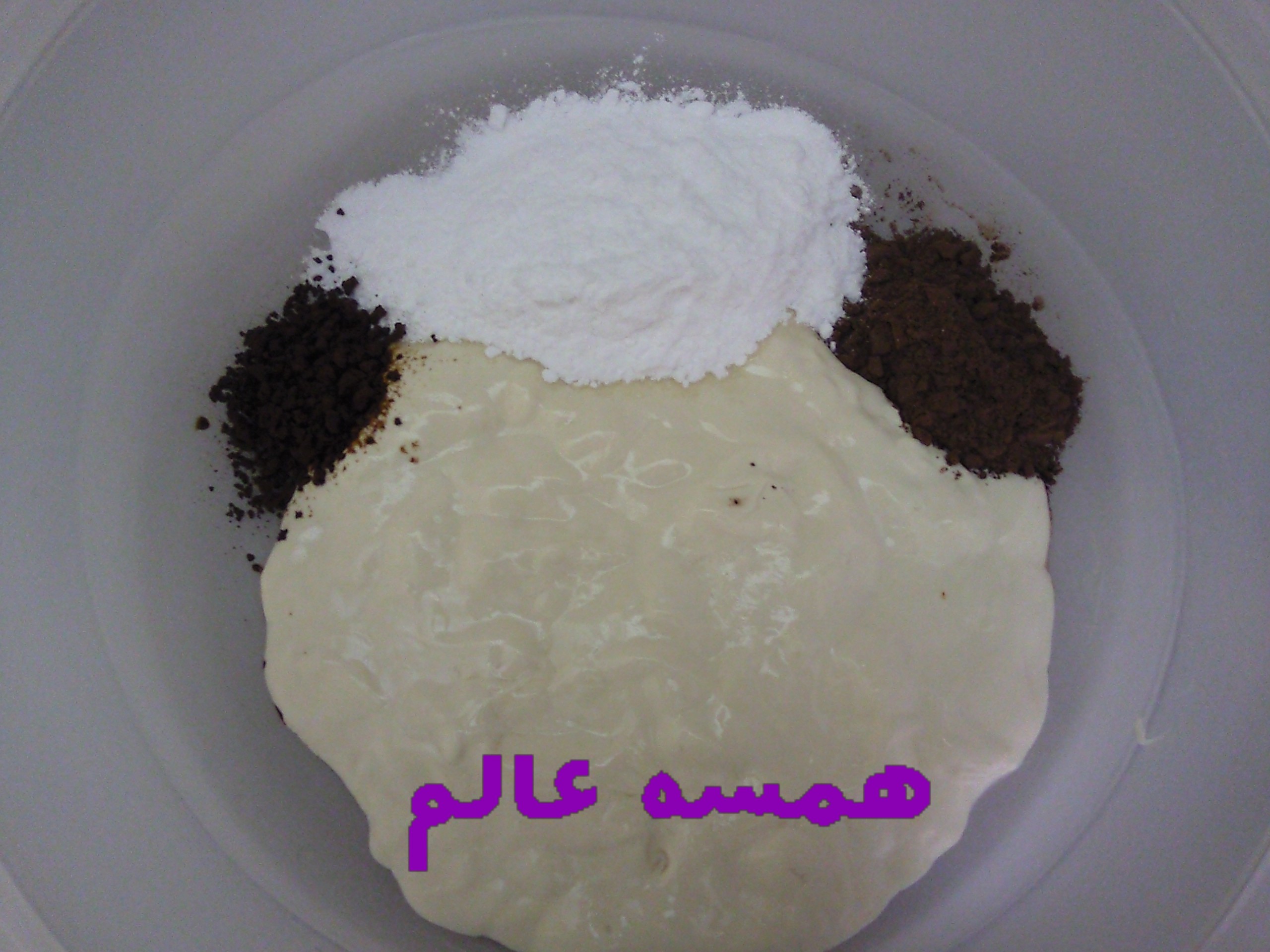 ويخلط قشطة وبودرة الكاكاو نسكافية وسكرويخلط جيد