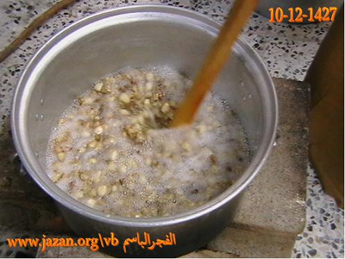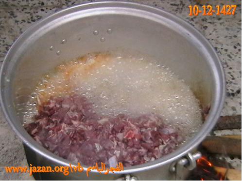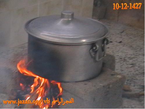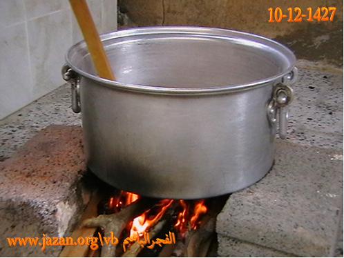 توقد النار وذلك باستخدام الحطب ويوضع فوقها قدر حجمه على حسب كمية اللحم