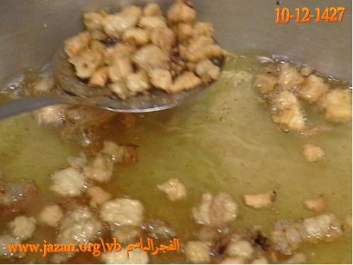 عند ظهور الزيت الناتج من الشحم يخرج الشحم ويبقى الزيت