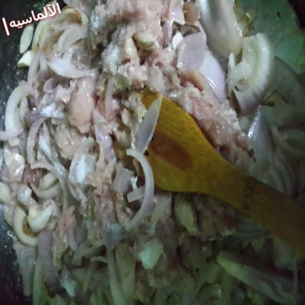 نقوم بتحمير البصل ثمَ إضافة الدجاج ونقوم بتقليبه