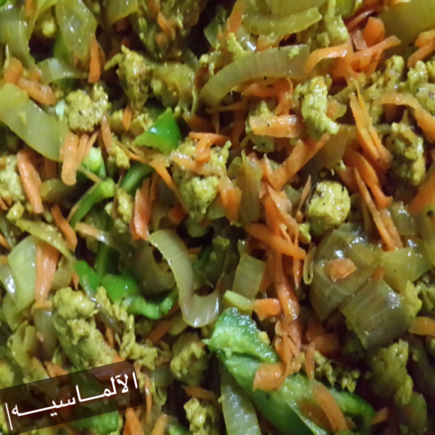 ..ثم نضيف البهارات ثم نقوم بإضافة الجزر والفلفل ونعمل بتقليبه..