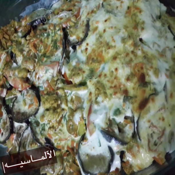 ثم نقوم بتجهيز الطبقه الاخيرهه -:تتكون من القشطه والجبنه والثوم المهروس،،نخلطها جيدا ثم نضعها ع الوجه وبعدين ندخل الصينيه الفرن