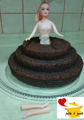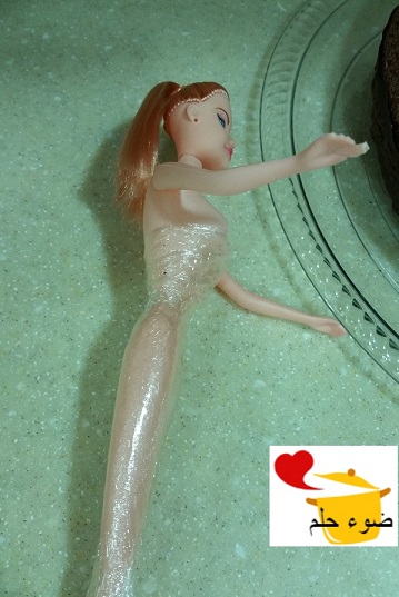 الحين نجي لهدف الفكرة .. نجيب عروسه لعبه ويفضل ان شعرها يكون قصير ,, ونقص الرجلين حتى يناسب طولها مع طول الكيكه وتصير متوازنه معها .. (( يفضل غسل الجسم بالصابون ))