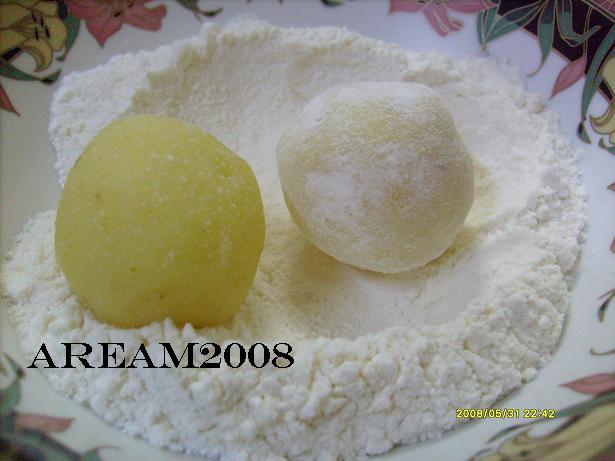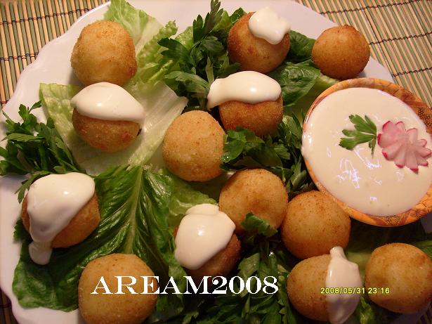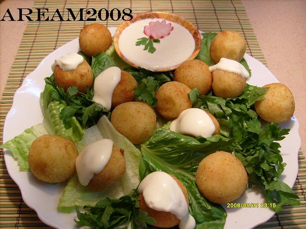 تقلي في زيت غزير وترى ما تاخذ وقت وهذا شكلها النهائي ويصب عليها بعض من الصوص وهو عبارة عن جبن سائل ومايونيز