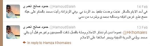 ومع ظهور بعض من يحاولون الدفاع عنه، فوجئ متصفحو موقع التواصل الاجتماعي "تويتر" بظهور شخصية حملت اسم شاب سعودي سبق أن أعلن اعتناقه للمسيحية، هاجم في تغريدات غريبة نشرت خلال اليومين الماضيين الرسول الكريم مطلقاً عليه أوصافاً لا تليق ولا يمكن ذكرها.
