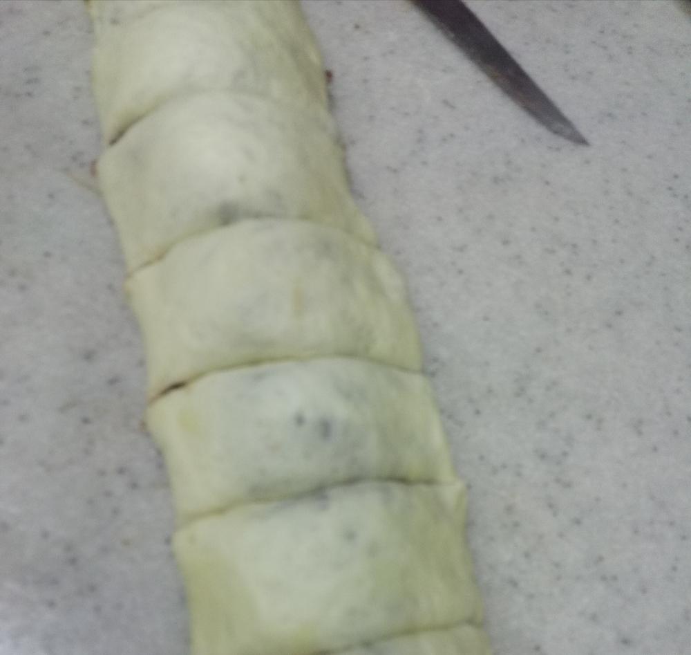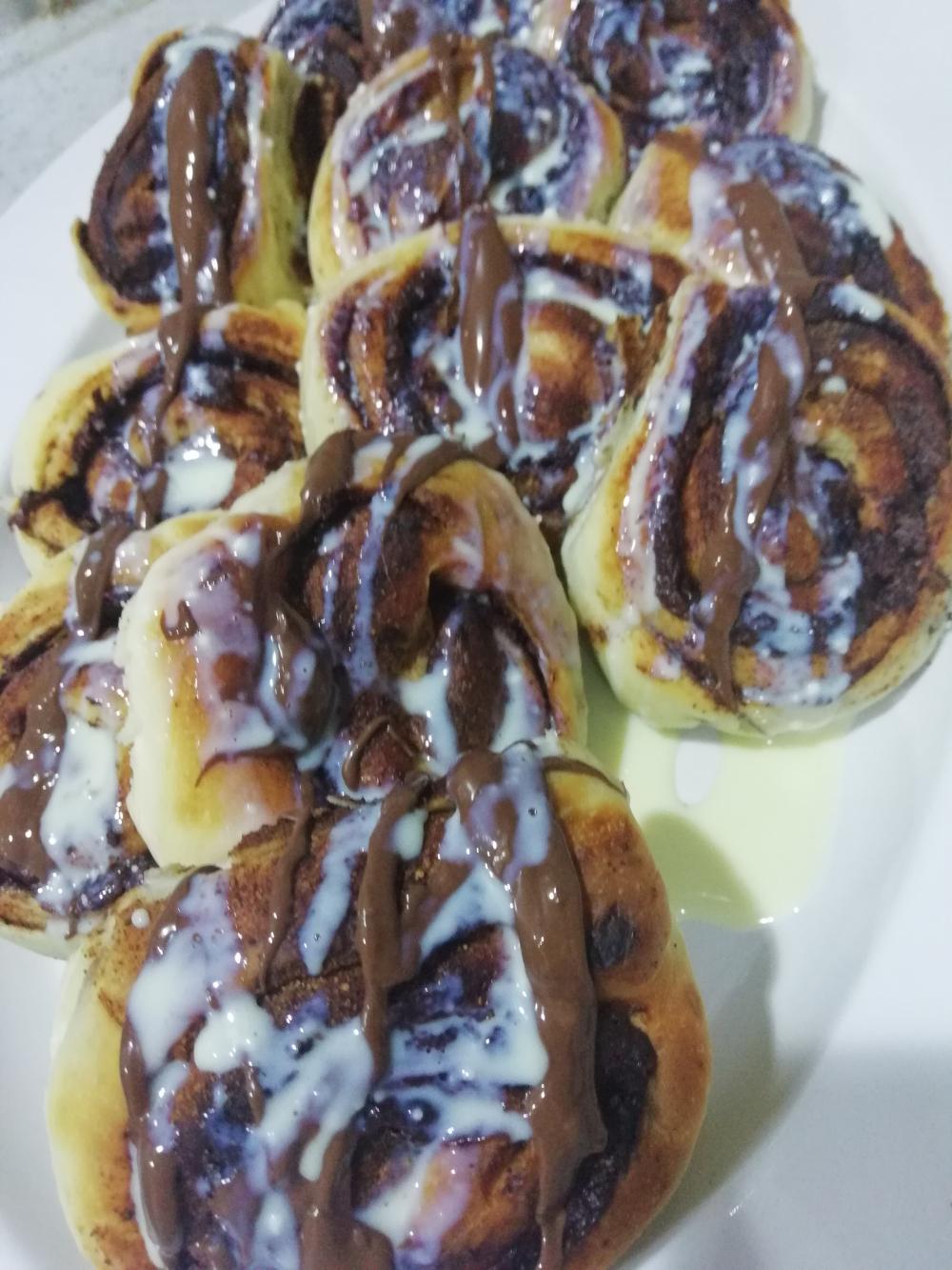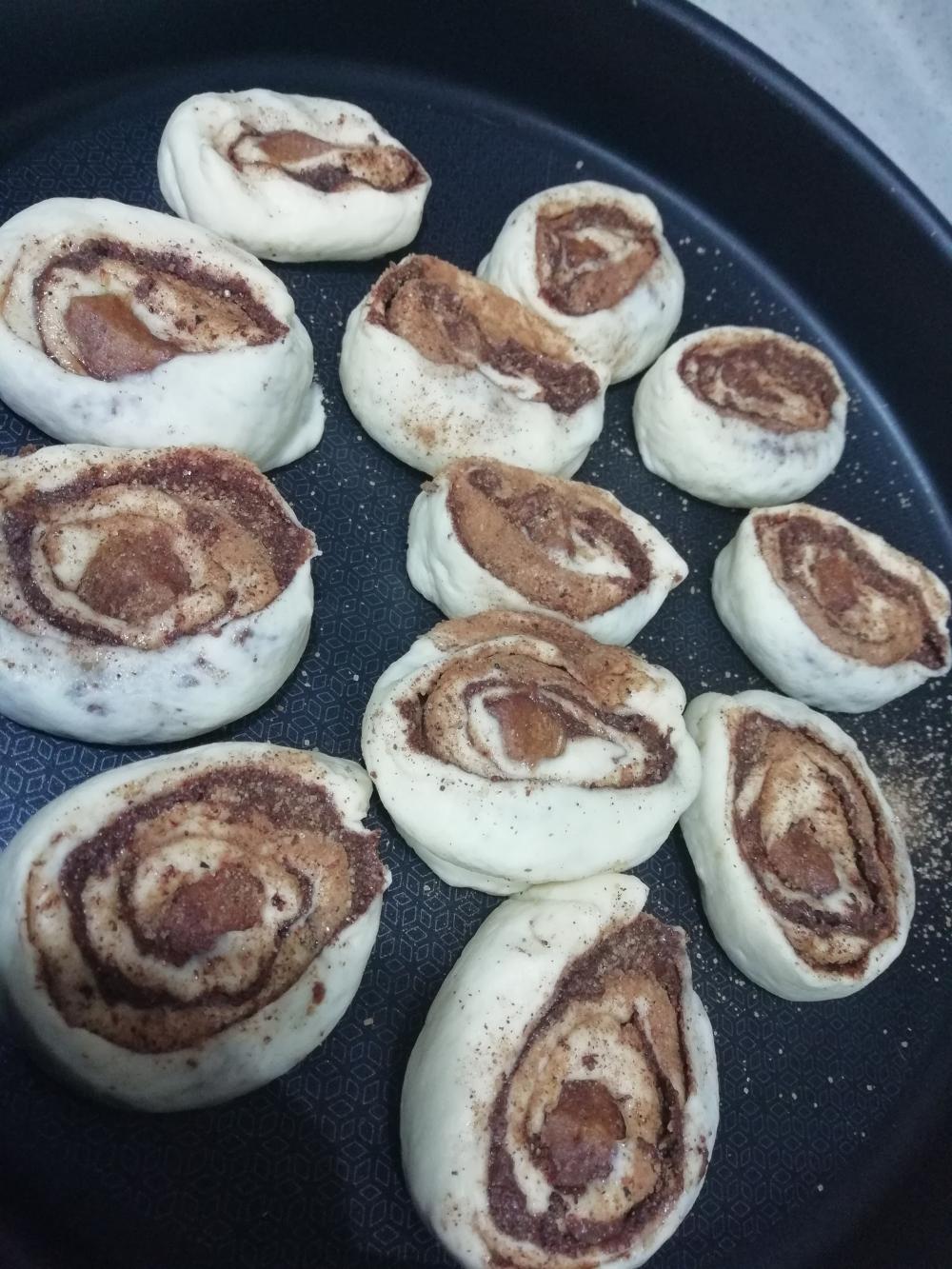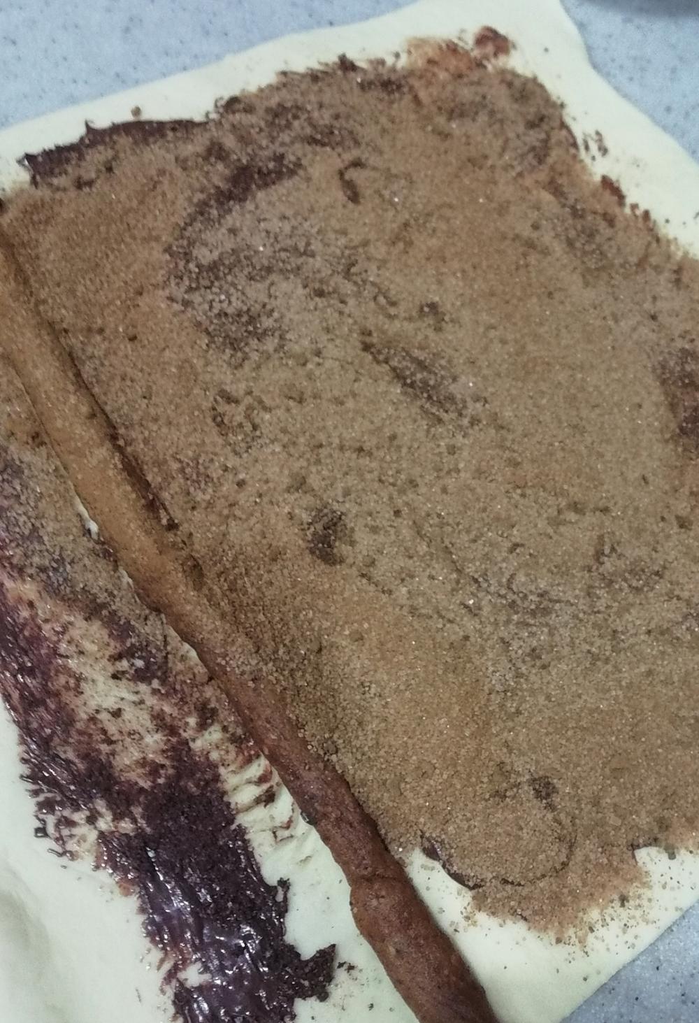 ادهني العجينة بالنوتيلا اووول وبعدها حطي تمررررر معجون وفي صحن اخلطي 2م قرفة