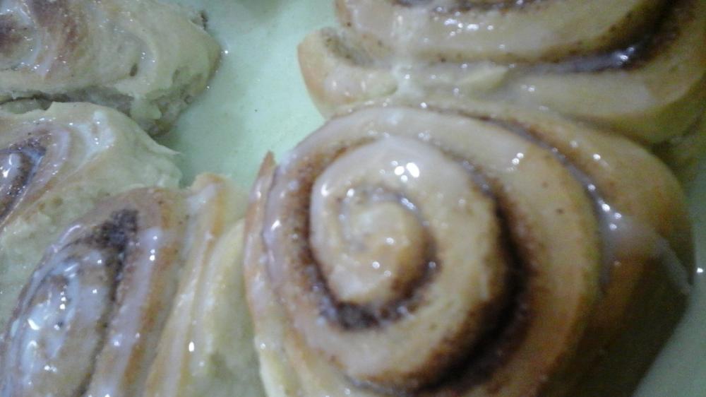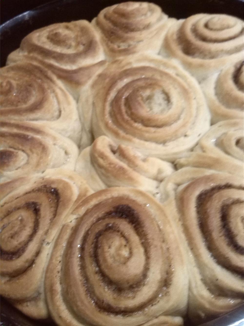 اتركيها تخمر نص ساعة او ساعة بعده افردي العجينة كلها لاسميكه ولا رقيقة وسط ضعي ادهنيها بالزبدة وبعده قرفة وسكر ولفيها رول وقطعيها في صينية رصيهم وغطيهم الين يتضاعف الحجم وعلى الفرن الين تستوي وتتحمر بالعافيةة يالله )).اخر شيء رشي عليها حليب مكثف ولا نوتيلا سائلةة ولا سكر مطحون ناعم تصير لذيذة