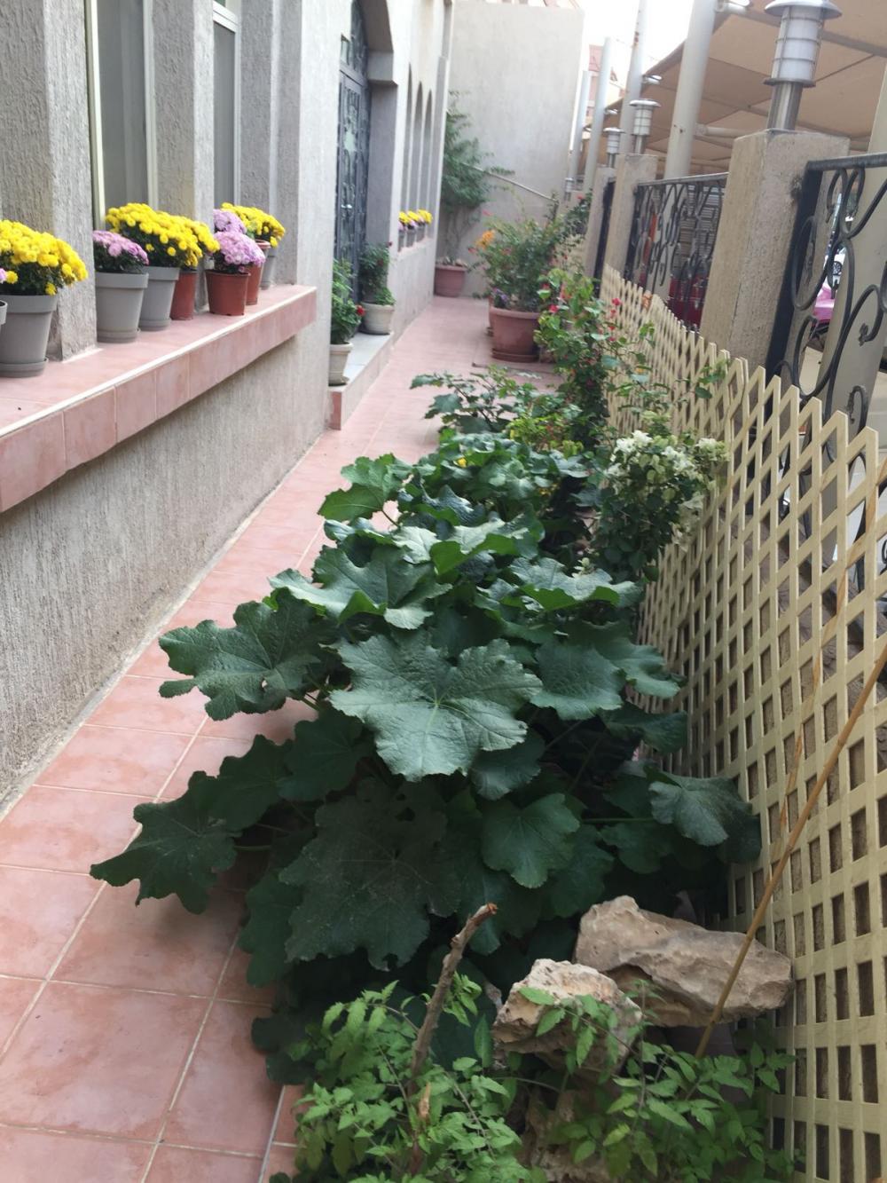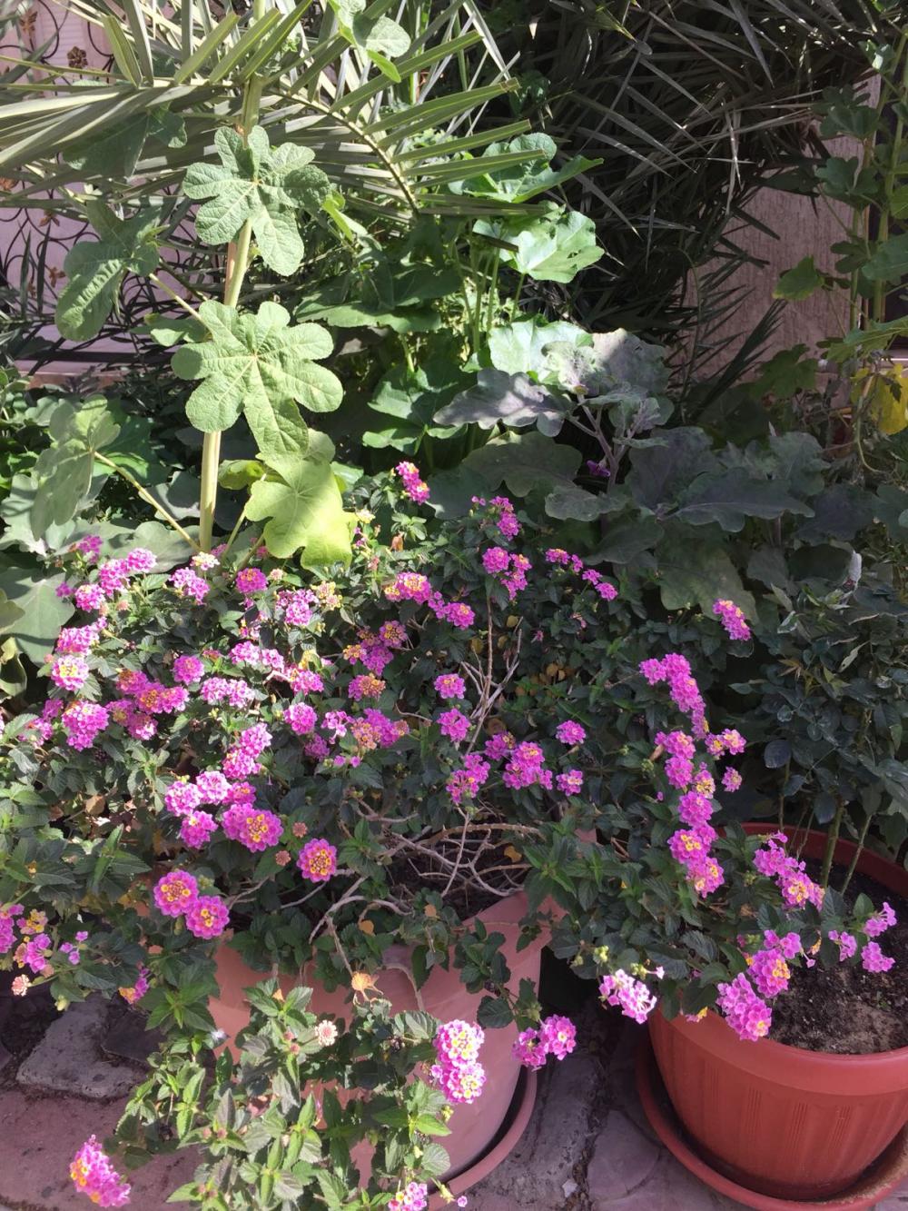 في الركن القريب من الصورة نبتة الطماطم والى جوارها ورد الختمة في طور النمو
