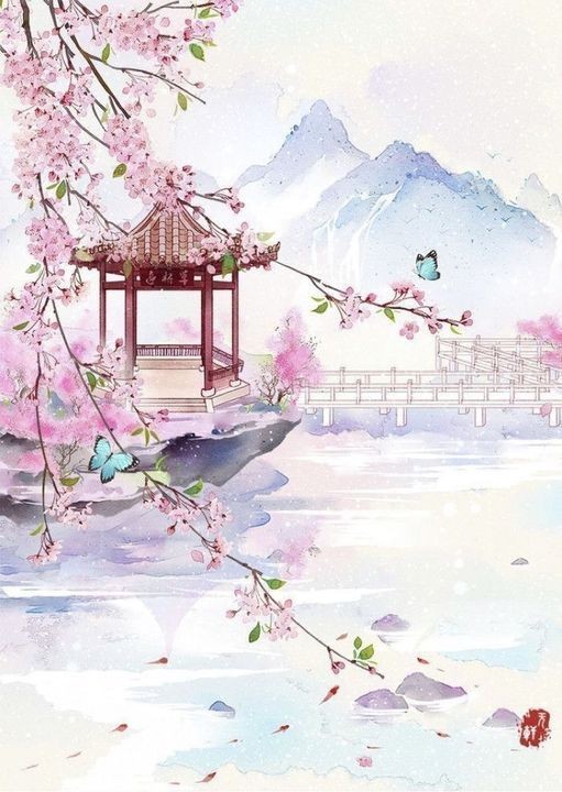 صباح ياباني جميل بين الجبال والزهر والفراشات والمظلة