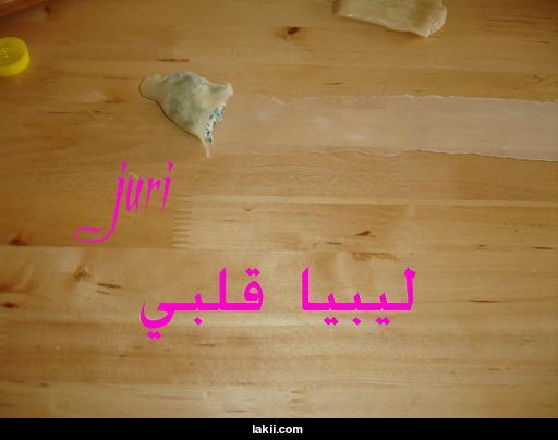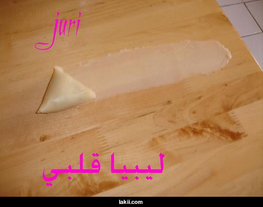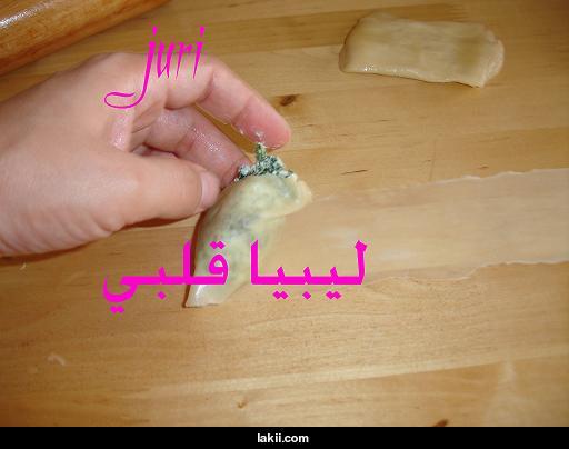يتم وضع قليل من الحشو وتلف العجينه الي النهايه مثل لف السنموسك