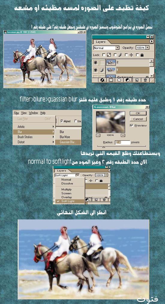 السلام عليكم ورحمة الله وبركاته شكر ا على الدروس وهذي تطبيقاتي :27: 1 تحويل الصورة من تدرج الرمادي الى الملون طبعا الصورةقبل وهي لبنت وانا سويت تمويه على الوجه والارجل لانه ممنوع اعتقد الصور الي كذا. وهنا عملت تحديد لاجزاء معينه ولونتها بس يبغالها دقه اكثر واستخدمت الاداة الحبل وهنا عملت لها تحديد كامل بعدين لونت الصورة كامله واستخدمت المربع للتحديد وهو اسهل 2 تلوين الصور بشكل جديد الصورة قبل الصورة بعد 3زيادة وضوح الصورة الصورة قبل الصورة بعد 4 اضافة لمسة مضيئة على الصورة الصورة قبل الصورة بعدالسلام عليكم ورحمة الله وبركاته شكر ا على الدروس وهذي تطبيقاتي :27: 1 تحويل الصورة من تدرج...