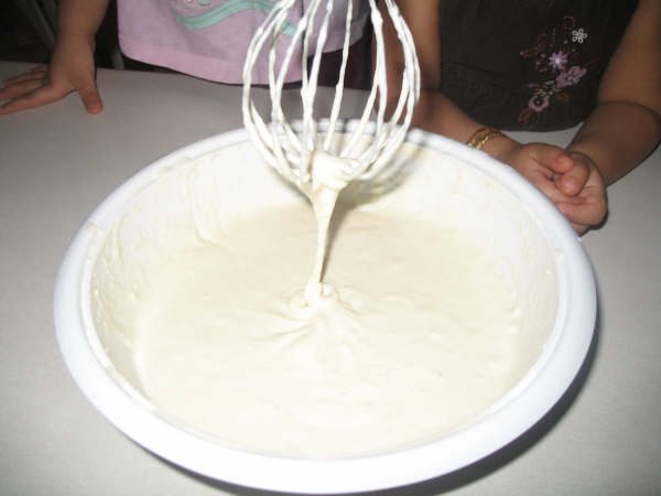 تخلطين كل المقاديرماعدا الدقيق بالخلاط (الجك) ثم تضيفين الدقيق ونخلط ويمكن استخدام خفاق الكيك..حتى تتكون عجينة قريبة من عجينة الكيك.