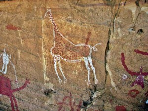 رسومات ملونة على الصخر في كهوف أكاكوس في ليبيا توضح حيوانات وبشر، وتبين التغير الدراماتيكي في الطبيعة في المنطقة.
